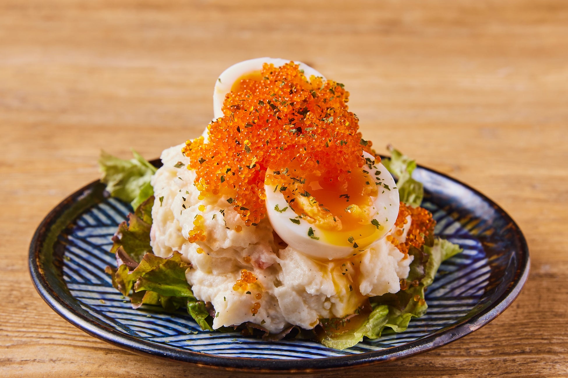 半熟のとろとろな卵を乗せた特製ポテトサラダ。