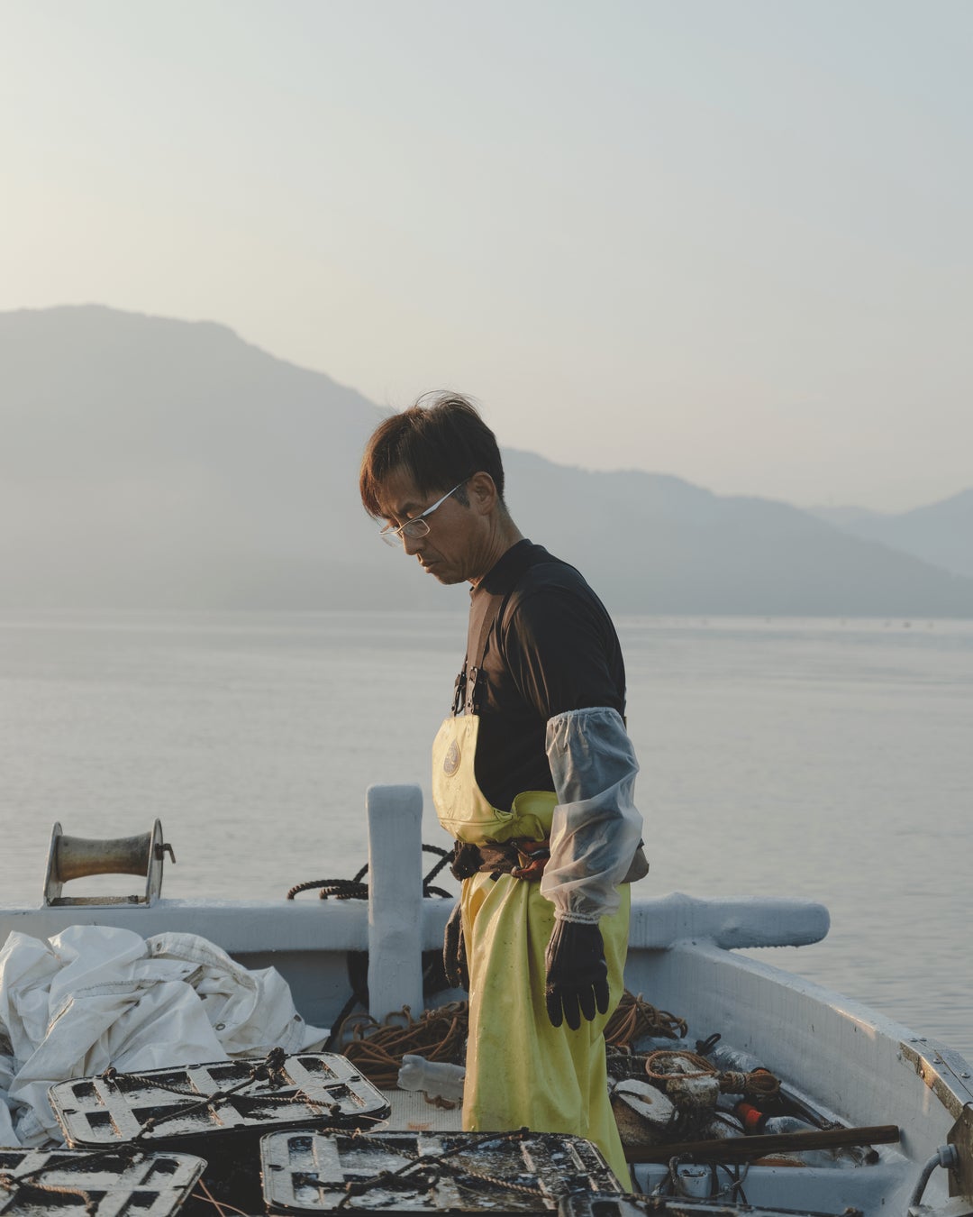 毎朝潮の状態を確認し、都度、より健やかに貝が育つ海域に連れて行く。