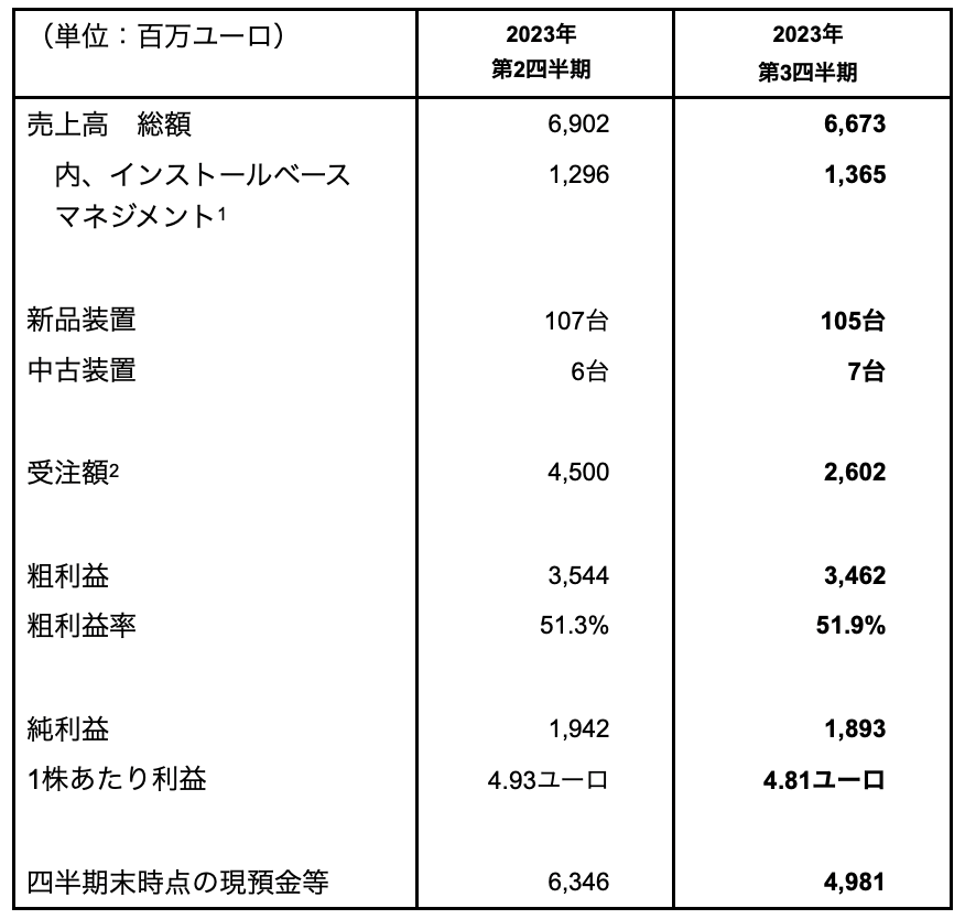 「2023 年第3四半期の売上高は67億ユーロで、予想範囲の中値近辺となり、粗利益率は51.9%と予想を上回る結果となりました。これは、主に、DUVの製品構成並びに一時的なコスト効果に拠るものです。