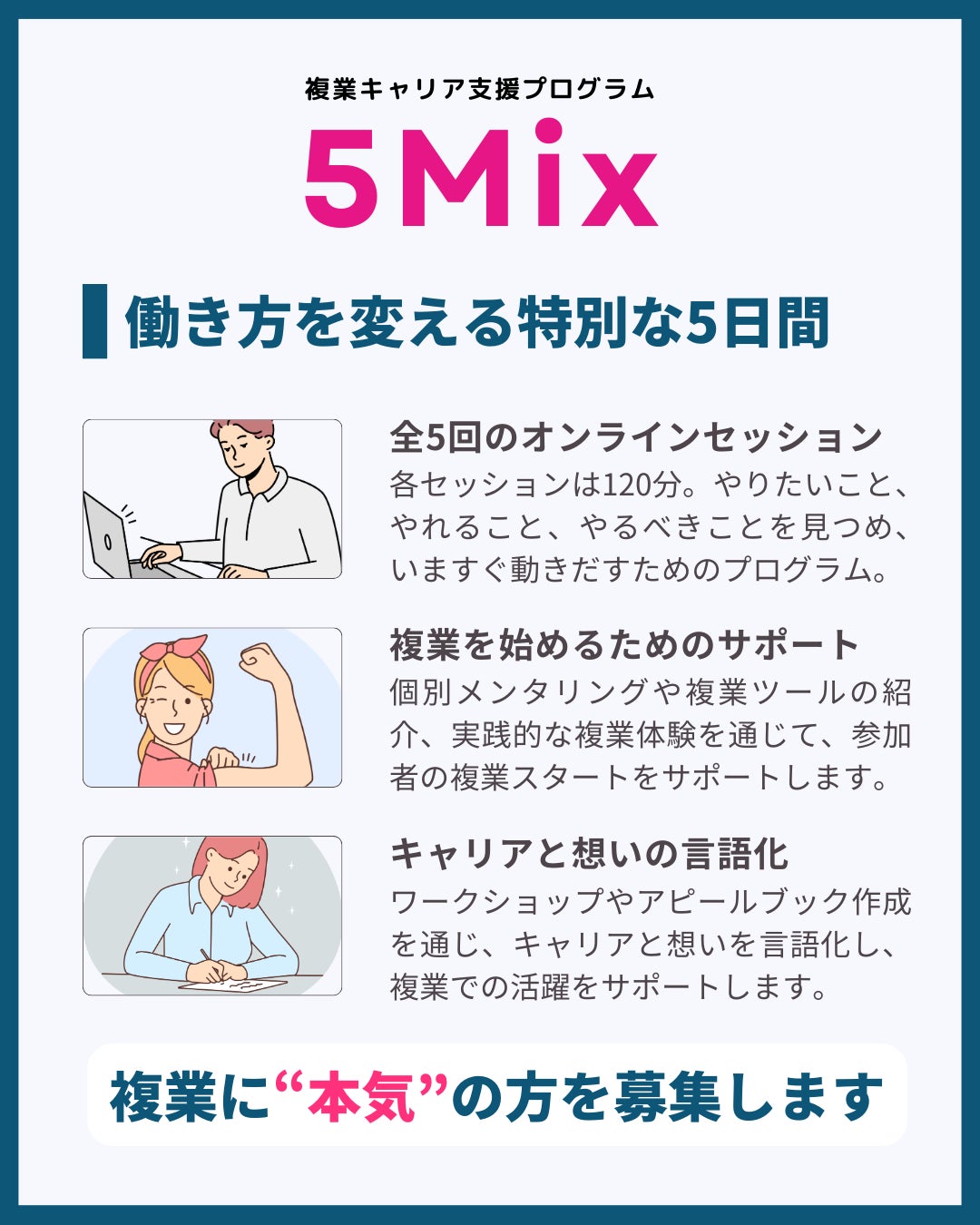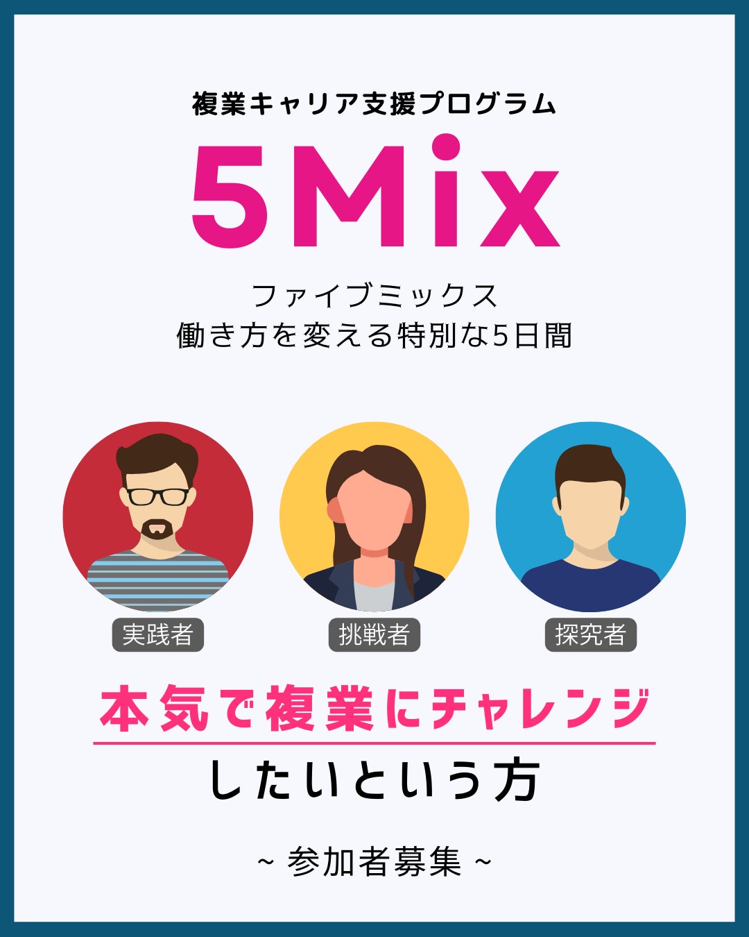 複業キャリア支援プログラム「5Mix」の次回参加者を募集しています。5Mixは、本気で複業にチャレンジしたい方を対象とした総合的なサポートプログラムです。