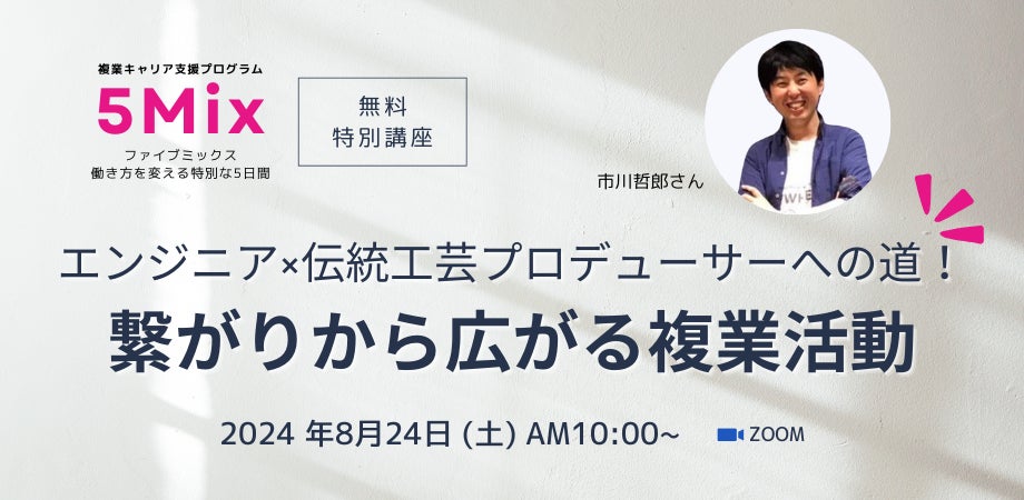 5Mixは、副業や複数の仕事に挑戦したい方々を全力でサポートする複業キャリアに特化したプログラムです。今回の特別講座では、講師に大手電機メーカーのエンジニアとして働きながら、伝統工芸の魅力を広める活動もされている市川哲郎さんをお招きします。市川さんご自身の経験を通じて、人とのつながりがどのように複業の可能性を広げるかについて、お話しいただきます。