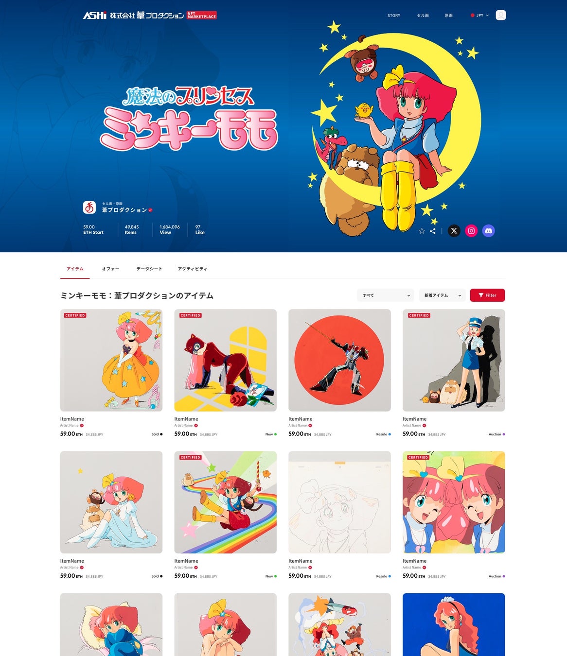 今回、RAKUZA株式会社と共同で発足する新プロジェクトに際し、「魔法のプリンセスミンキーモモ」シリーズのセル画NFTを楽座サイト内で先行販売を開始いたします。