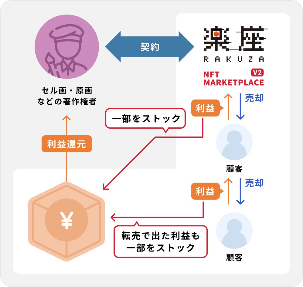 この新機能は、楽座内で販売しているセル画などの著作権者と契約し、NFTにより所有権が売買された際に手数料が付与される仕組みです。また、まだ著作権者や制作者と契約できていない商品についても、契約時にこれまでの利益を著作権者に送金できるよう、楽座内で売上がストックされます。