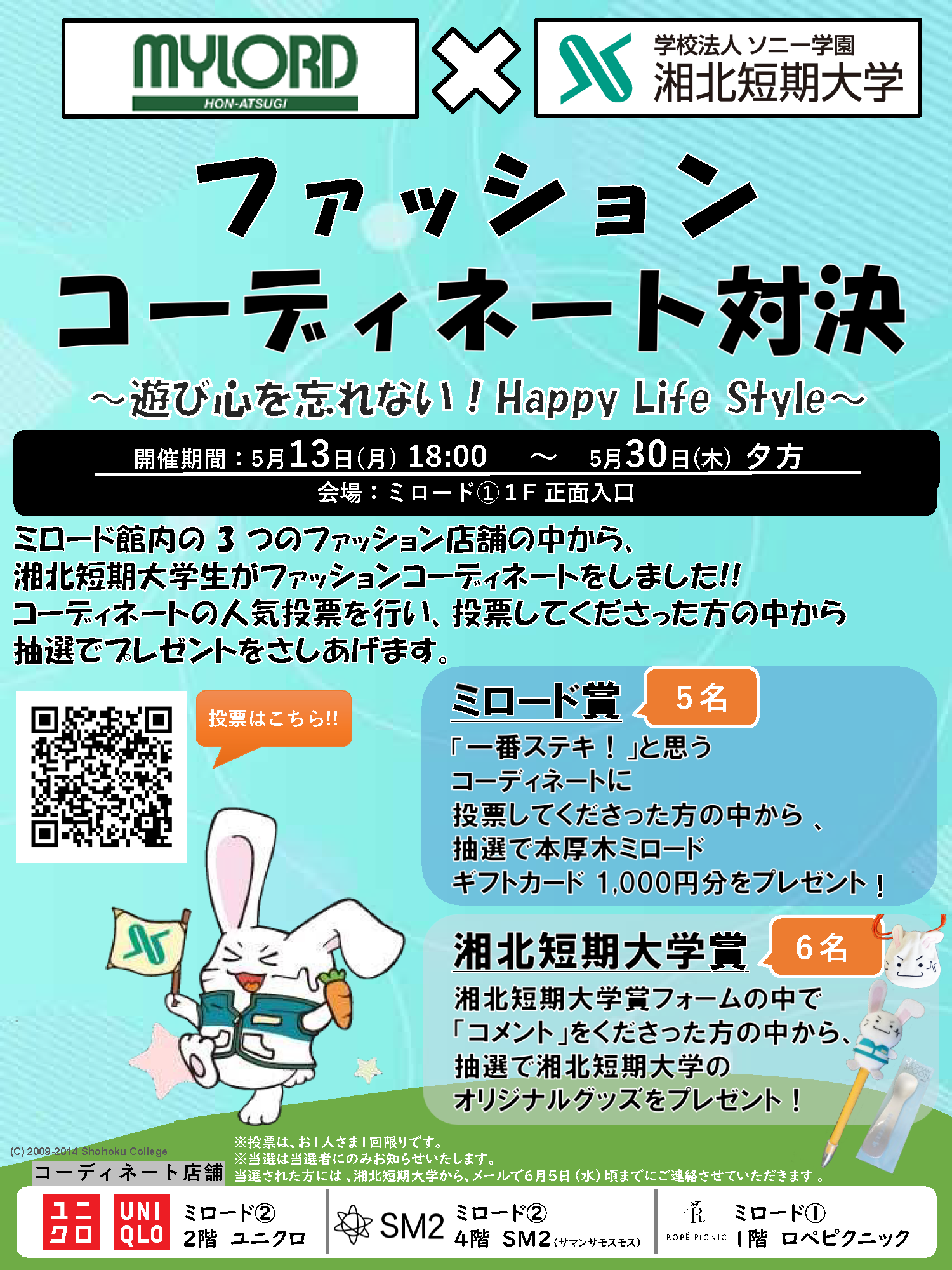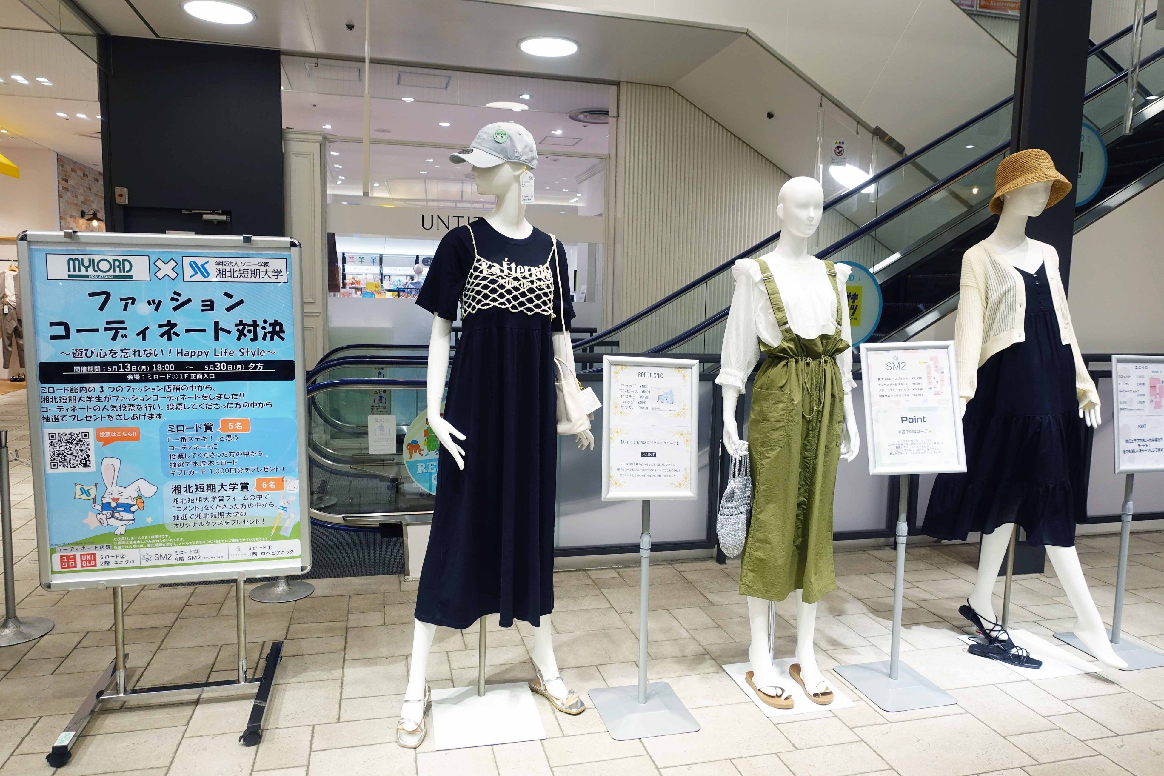 このイベントは、本厚木ミロード館内の3つのアパレルショップについて、湘北短期大学生活プロデュース学科2年の学生が各店舗の商品を使ったファッションコーディネートを行い、ミロード①1階正面入り口に展示、来場者による人気投票を行うものです。投票いただいた方の中から抽選でプレゼントを進呈します。本学の学生にとっては、授業「ファッションコーディネート演習」で学んでいることを提案して、実社会からレスポンスを得て、今後の学びに生かすとても貴重な機会になります。また、期間中には総合ビジネス・情報学科鈴木ゼミの学生によるプロモーション活動も行います。同じく大学での学びを試し、実践経験を積む貴重な機会です。