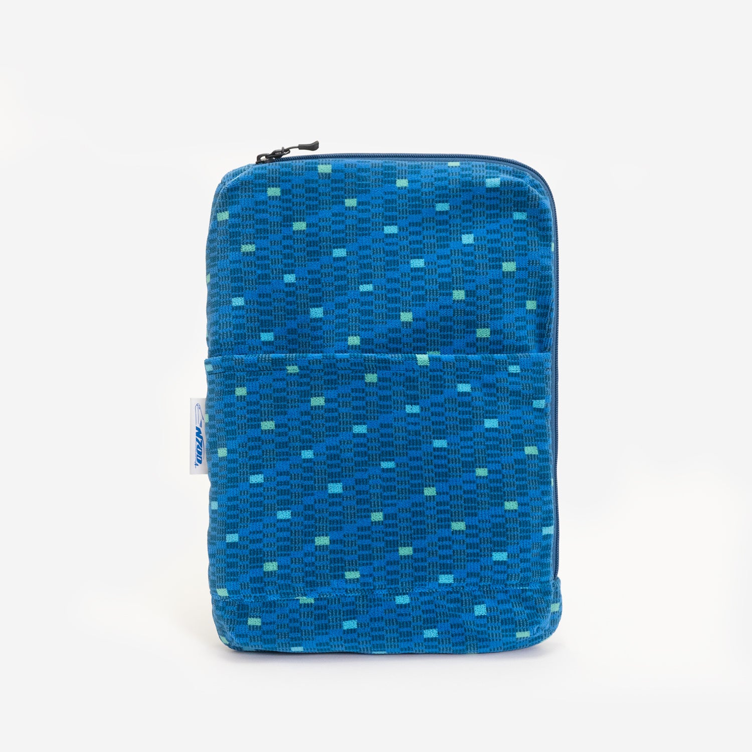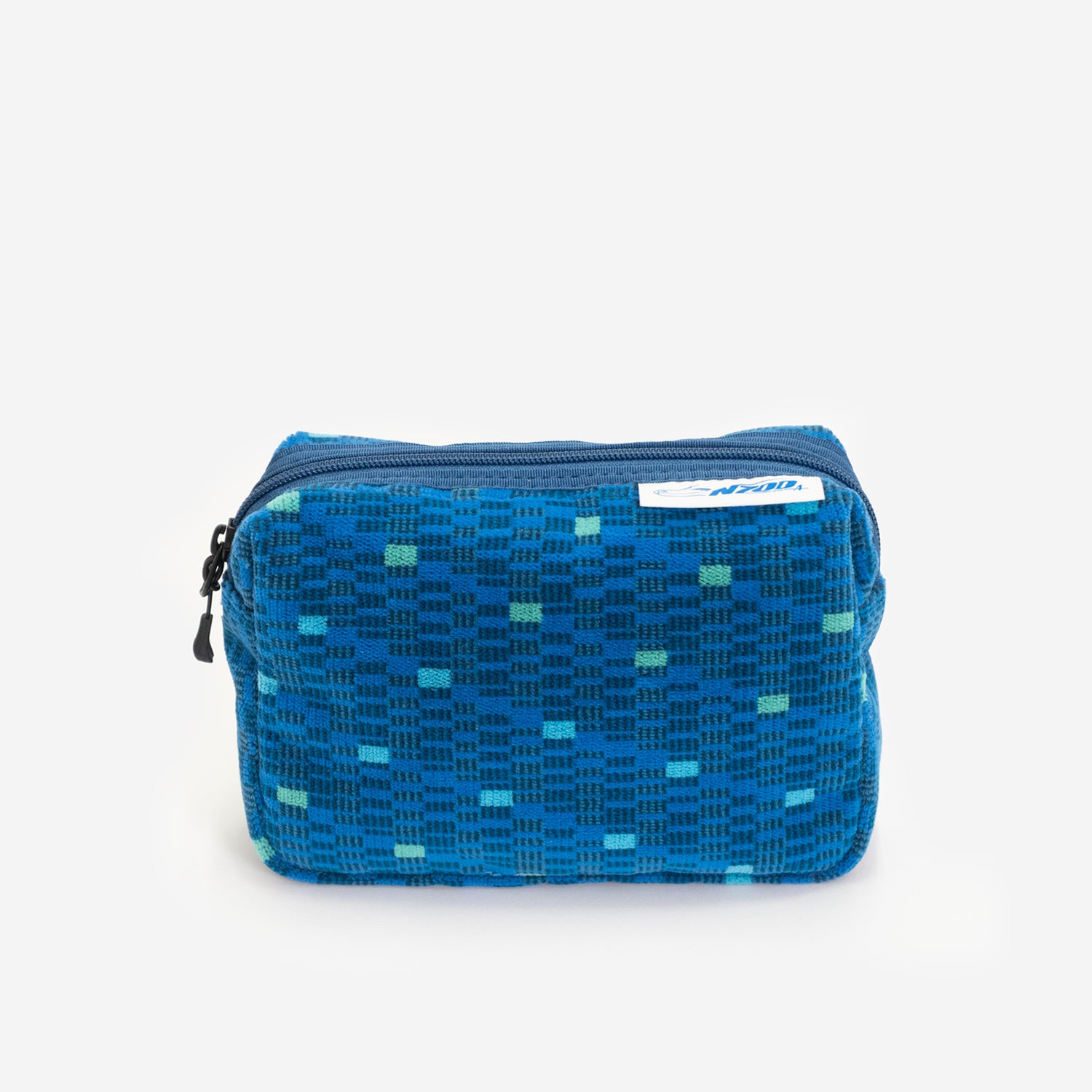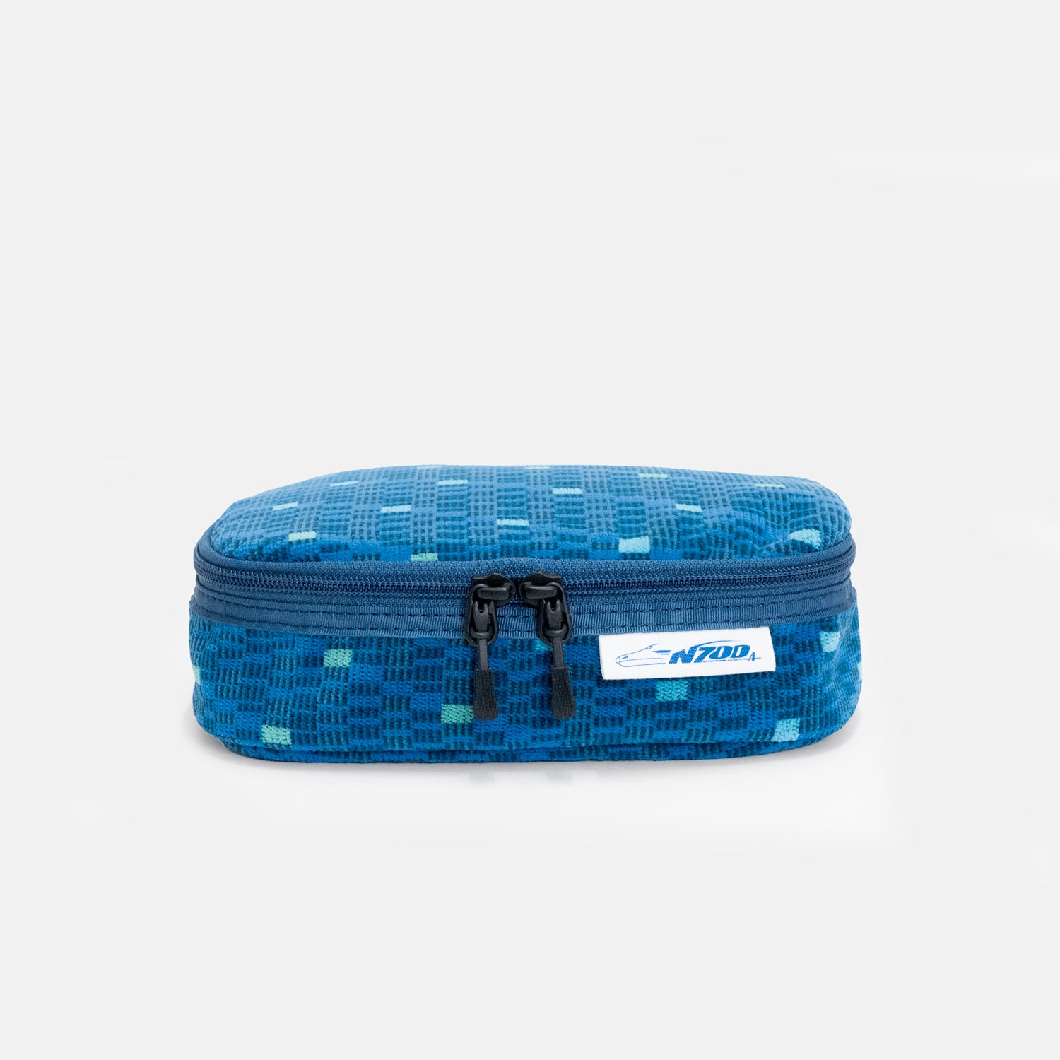 実際に東海道新幹線N700系typeAの普通車に使用されていたブルーの座席生地を使用しています。バックル留めの仕切りやファスナーポケット、荷物を固定できるベルト付き。