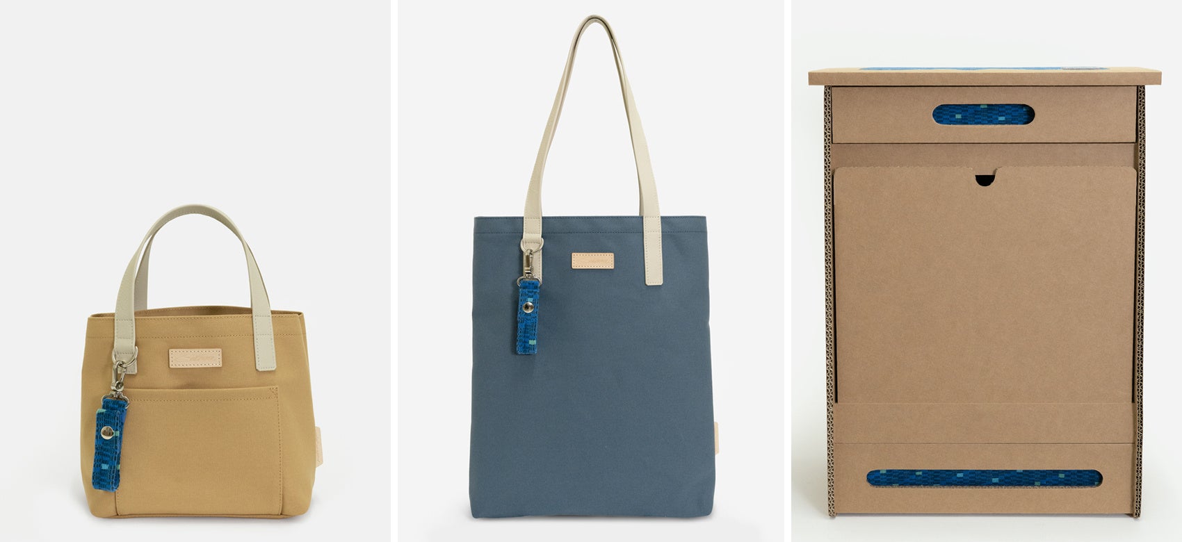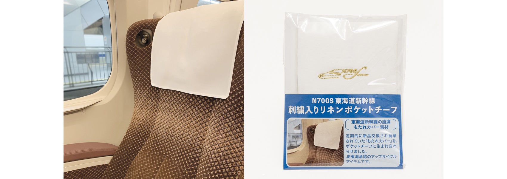 定期的に新品交換され廃棄されていた、東海道新幹線の座席の「もたれカバー」を再利用したポケットチーフや、座席モケット生地を採用したトートバッグ(S/Lサイズ)など、自社オンラインストアで販売中。