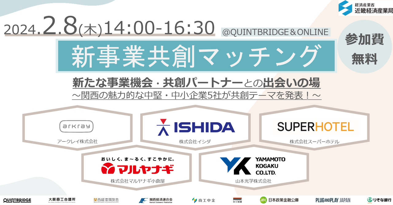 ・共催:NTT西日本 QUINTBRIDGE、 大阪商工会議所、一般社団法人関西経済同友会、公益社団法人関西経済連合会、株式会社商工組合中央金庫、独立行政法人中小企業基盤整備機構 近畿本部、株式会社日本政策金融公庫、Plug and Play Japan株式会社、株式会社りそな銀行(50音順)