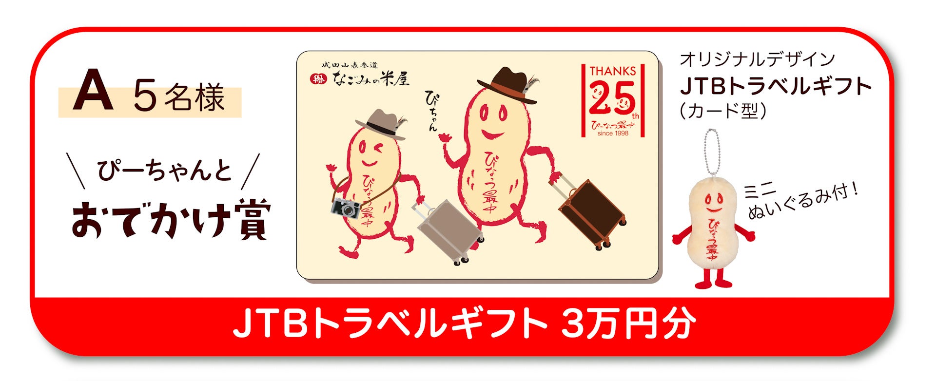 同じく10月1日から開催する「ぴーなっつ最中25周年 ありがとうキャンペーン」は、誰でもご応募いただけるプレゼント企画で、クイズの正解者から抽選で65名様に、トラベルギフト3万円分、記念商品「ぴーなっつ最中25周年記念缶 6個詰」などをプレゼントします。