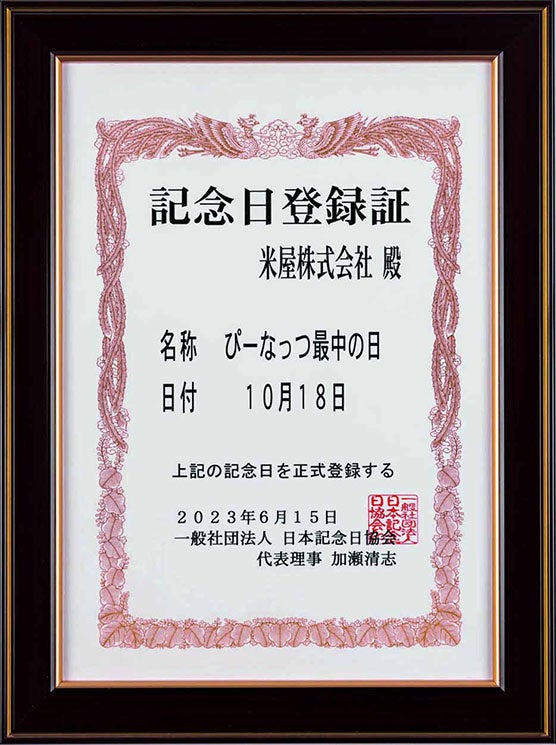 なごみの米屋では、この度、10月18日を「ぴーなっつ最中の日」に制定し、一般社団法人日本記念日協会の認定を受けました。