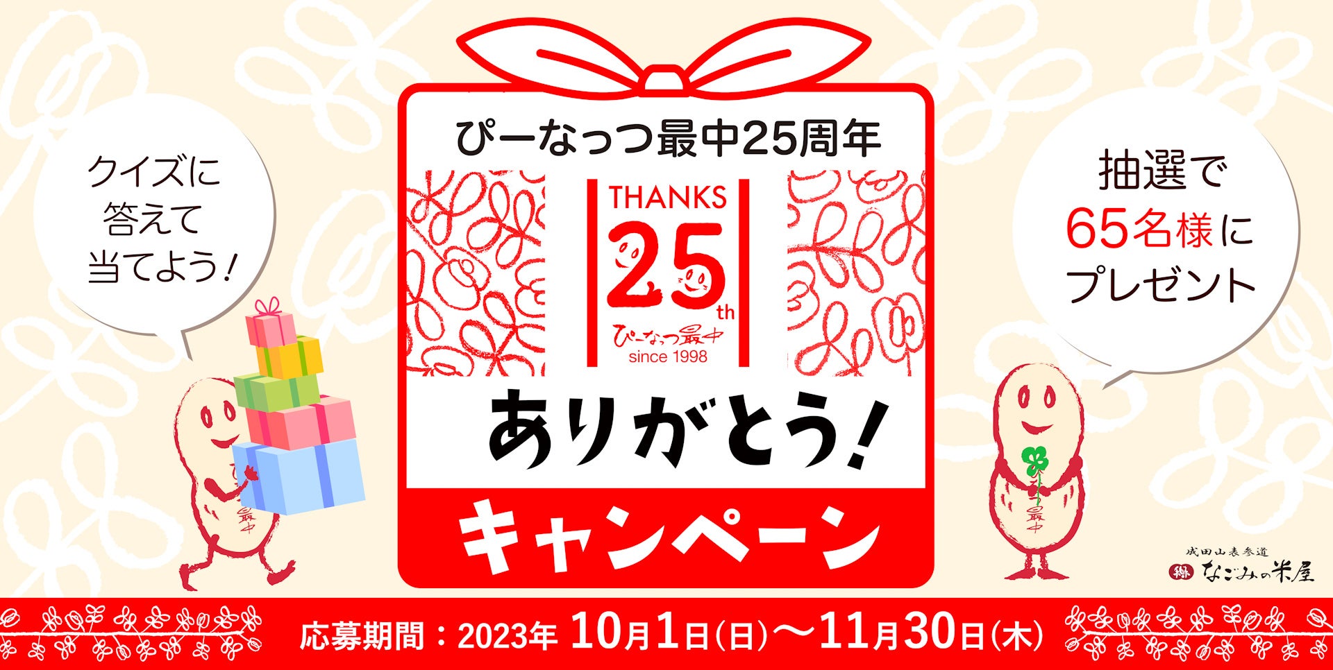 皆さまへの感謝の気持ちを込めて、「ぴーなっつ最中25周年 ありがとうキャンペーン」を2023年10月1日(日)より開催します。本キャンペーンは、クイズに正解した方の中から抽選で65名様に賞品が当たる、どなたでもご応募いただけるプレゼント企画です。たくさんのご応募お待ちしております。