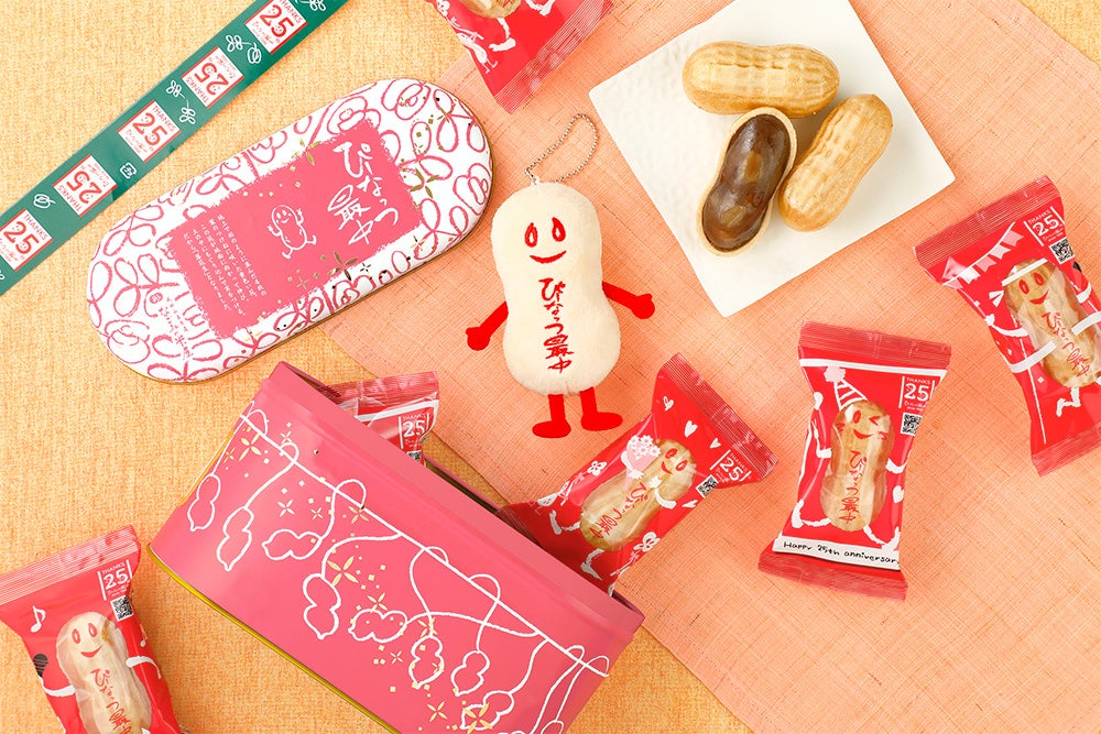 ぴーなっつ鹿の子やぴーなっつバターの配合などを見直し、落花生の風味が増してより美味しくなった「ぴーなっつ最中」と、この商品のキャラクター「ぴーちゃん」のミニぬいぐるみを25周年限定のデザイン缶に詰め合わせた特別商品を、数量限定で販売します。