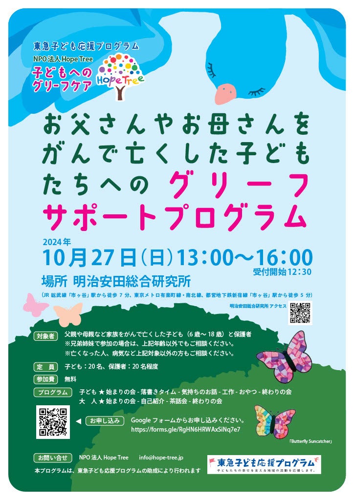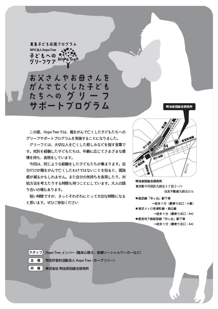 特定非営利活動法人Hope Tree主催、明治安田総合研究所の共催にて、がんで親を亡くした子どもたちへのグリーフサポートプログラムを実施いたします。