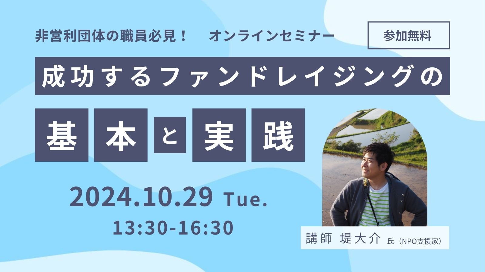 公益財団法人京都市環境保全活動推進協会(所在地:京都市伏見区深草池ノ内13、理事長:新川達郎)は、2024年10月29日(火)に、NPO支援家の堤大介氏を迎え、「成功するファンドレイジングの基本と実践」のオンラインセミナーを開催します。