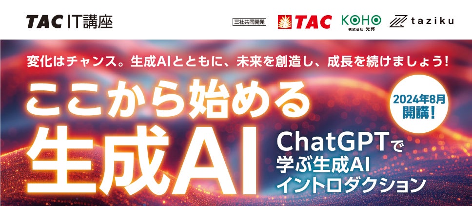 株式会社光邦(本社:東京都千代田区、代表取締役社長:前田剛宏 以下、「光邦」)は、TAC株式会社(本社:東京都千代田区、代表取締役社長:多田敏男 以下、「TAC」)ならびに株式会社taziku(本社:東京都渋谷区、代表取締役社長:田中義弘 以下、「タジク」)と、企業において生成AIを適切かつ積極的に利用する人材を育成するための教育コンテンツとして、「ここから始める生成AI ChatGPTで学ぶ生成AIイントロダクション」を共同開発、eラーニングによる学習コースとして提供を開始します。