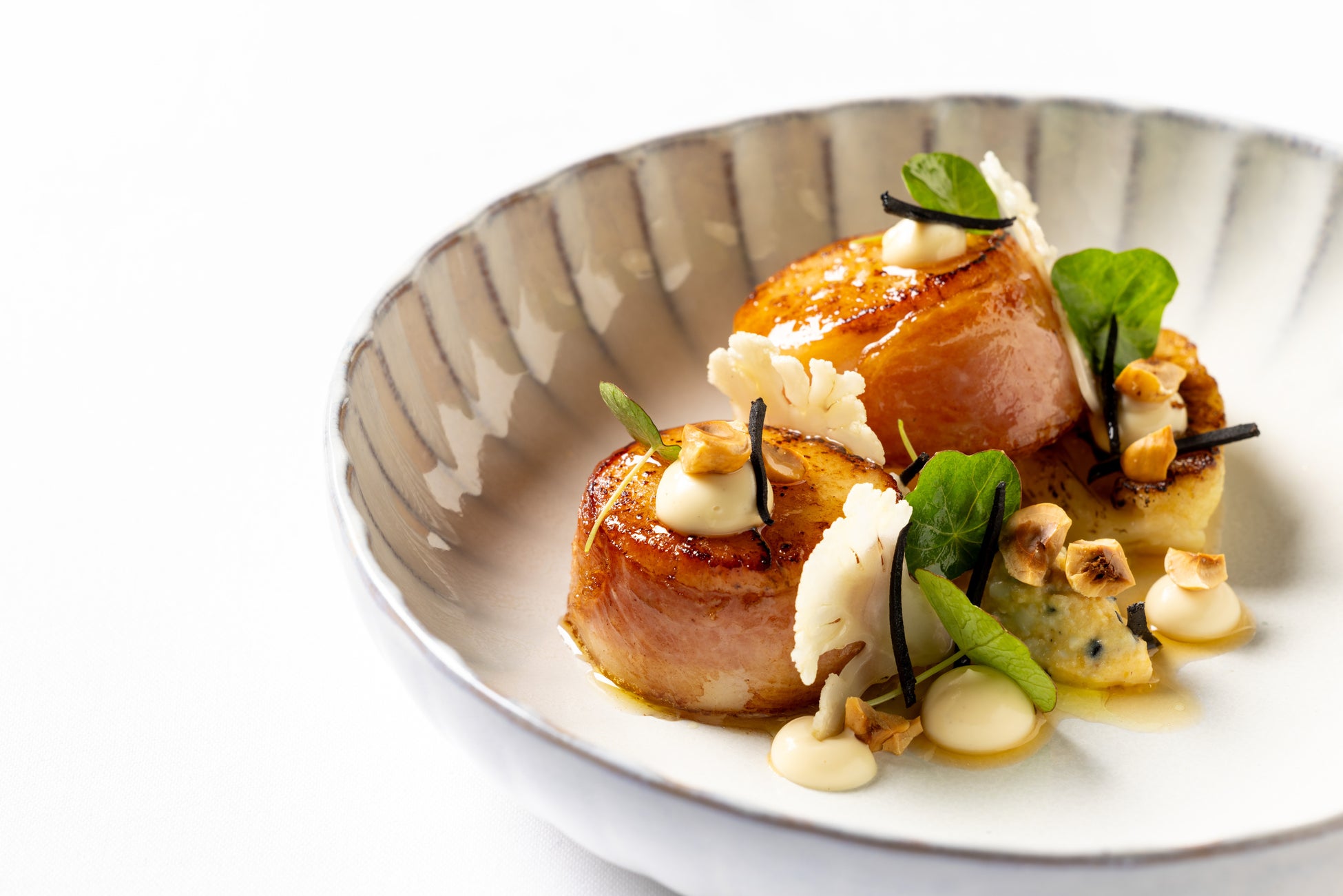 甘みが強く肉厚な宮城県産のホタテをチロル産スペック(低温燻製した生ハム)で包みふっくらとソテーし、旬の黒トリュフ、エンダイブとコーヒービネグレットで風味付けしたシェフ デニスによる渾身の逸品。ほろ苦いコーヒーとエンダイブのフレーバーがホタテの甘みを引き立てる、出演者も絶賛の一品をご賞味ください。
