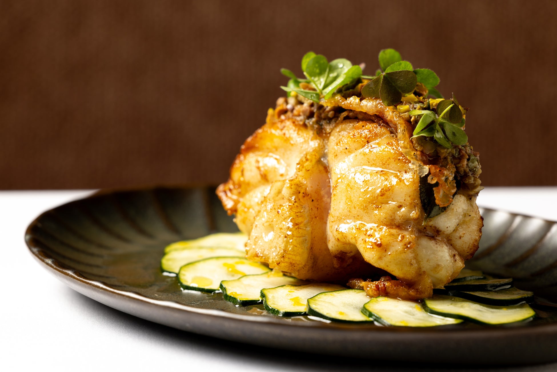 魚料理のメインには、シェフ デニスおすすめの特別食材としてご紹介した、今が旬の旨味の濃いアンコウのローストをご用意しました。クラシカルなイタリアの家庭料理“サルティンボッカ”をル・プリスティンテイストにアレンジ。絶妙な火入れで仕上げたジューシーなアンコウとハーブ香るグアンチャーレ(ほほ肉を塩漬けし乾燥させた生ハム)、焦がしバターの香ばしい風味が食欲をそそります。