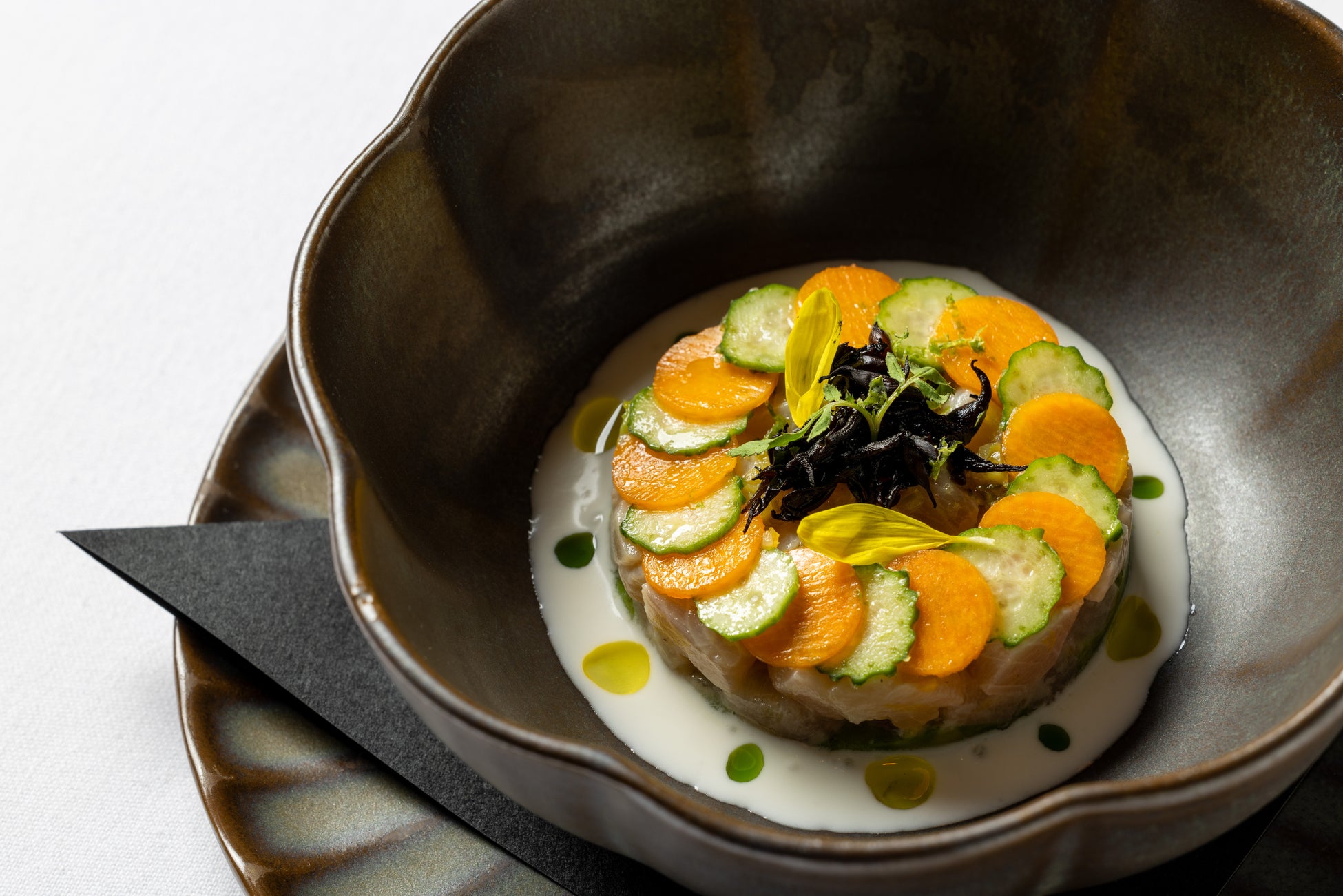 ル・プリスティンのクラシカルなクルードを和の食材でアレンジした、東京店オープン時より愛されるシグネチャーディッシュ。オランダ産のトマス醤油、紫蘇とハバネロのビネグレットでさっぱりと仕上げたハマチのタルタルをアボカドに重ね、かぼちゃのピクルスとミニキュウリ、ヒジキのマリネをトッピング。出汁香るサワークリームが全体をまろやかに包み込む、和洋融合が楽しめる一品です。