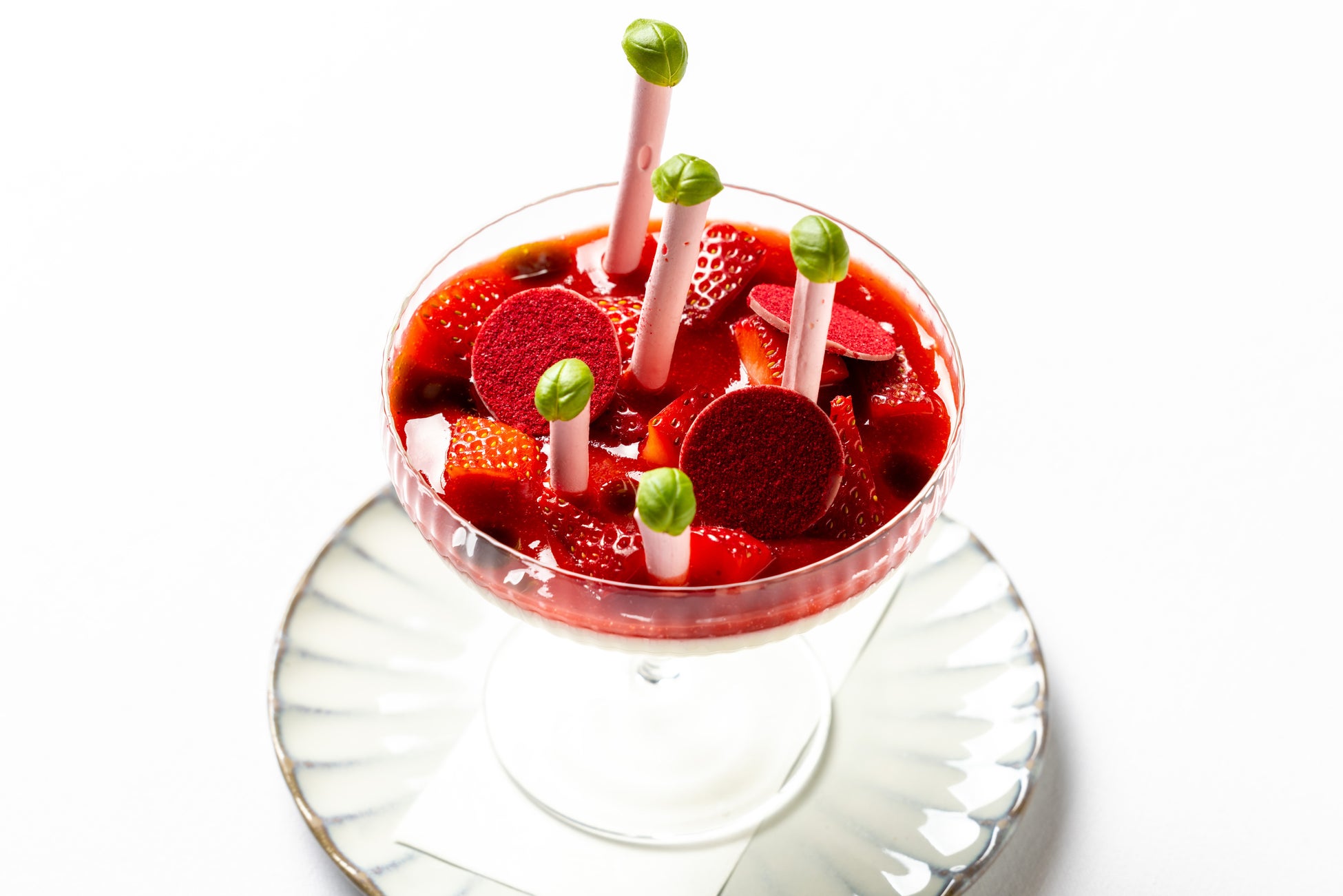 シェフ セルジオの世界観があふれる独創的なプレゼンテーションが目を引くシグネチャースイーツ。北海道産の濃厚なクリームとマダガスカル産バニラで仕立てたコクのあるパンナコッタに、フレッシュなあまおうとルビーチョコレートを添えた、甘さと酸味のバランスが絶妙な一品。トンカ豆とピンクペッパーの香りをまとわせたストロベリーソースにフレッシュなバジルのアクセントが心地よく、コースを爽やかに締めくくります。