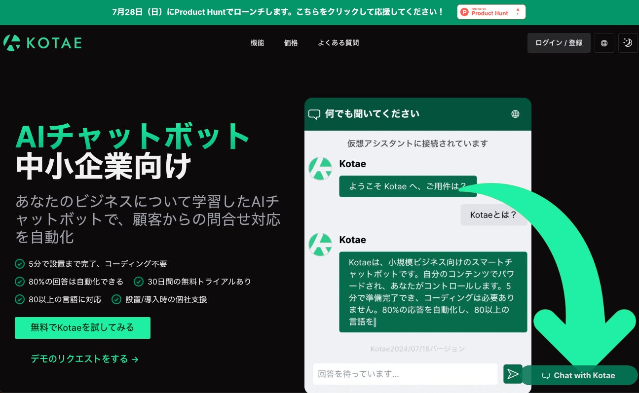 Kotaeはチャットボットをもっと身近にするサービスです。コーディングは一切不要で5分でウェブサイトへの設置が完了します。必要に応じた導入支援を通じ、お客様のビジネスに確実な効果をもたらします。