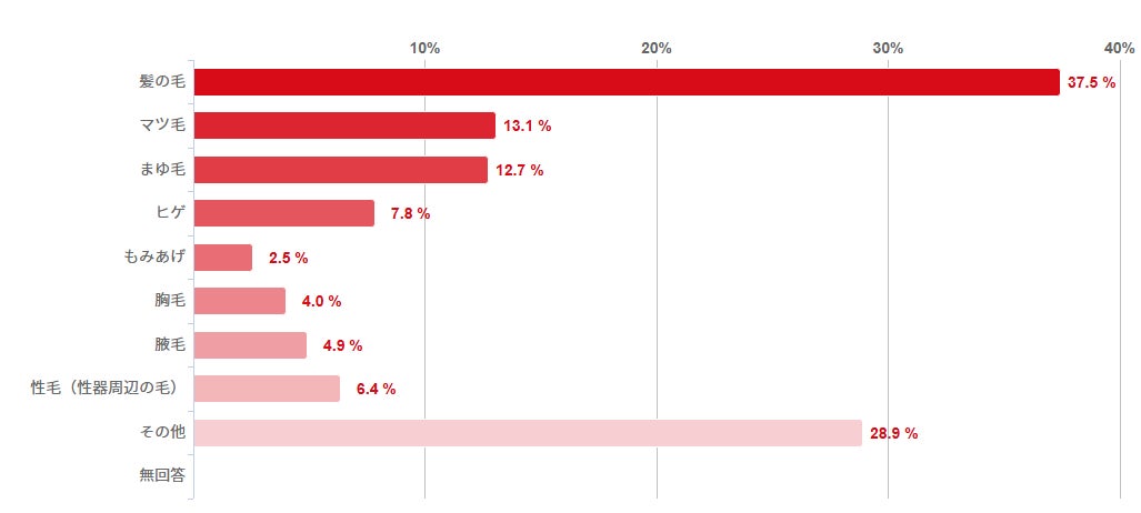 発毛に関する悩みを持つ部位について、37.5%の方が「髪の毛」を回答しています。これに対して、「マツ毛」13.1%、「まゆ毛」12.7%、「ヒゲ」7.8%、「もみあげ」2.5%と顔面の体毛に悩みをお持ちの方がいらっしゃいます。一方で、「性毛」6.4%、「腋毛」4.9%、「胸毛」4.0%と、普段隠された体の部位に悩みを持つかたも少数ながらいらっしゃいます。「その他」と回答された28.9%の方の大多数は自由回答にて悩みは「特にない」と回答しましたが、多くの方が「体毛」に対する悩みをお持ちであることがわかりました。