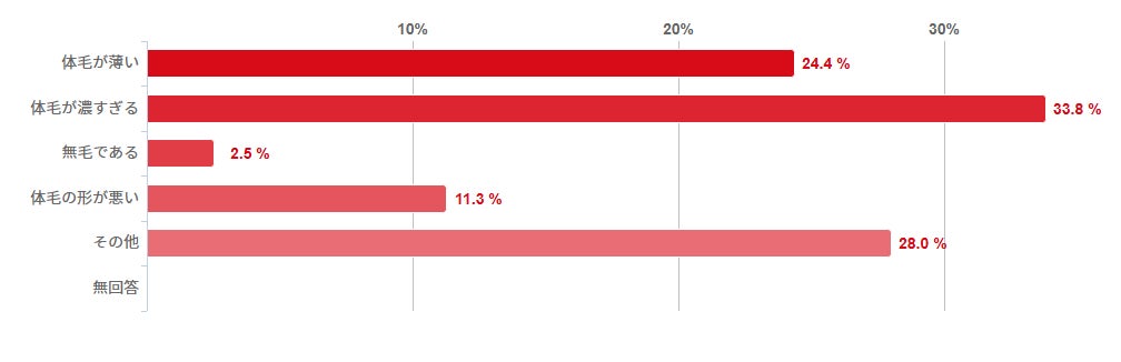 「体毛が濃すぎる」と回答した方(33.8%)に対して「体毛が薄い」と回答した方は24.3%と、体毛の濃さ薄さについては大きな差はみられませんでした。また、「体毛の形が悪い」11.3%、「無毛である」2.5%