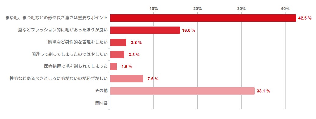 「まゆ毛、まつ毛などの形や長さ濃さは重要なポイント」42.5%、「髭などファッション的に毛があったほうがよい」16.0%、とルックスやファッションの観点で体毛の悩みを持つかたが大多数です。一方で「性毛などあるべきところに毛がないのは恥ずかしい」7.6%、「胸毛など男性的な表現をしたい」3.8%、「間違って剃ってしまったのではやしたい」3.3%、「医療機関で剃られてしまった」1.6%など多様な悩みを持つ方がいらっしゃいます。