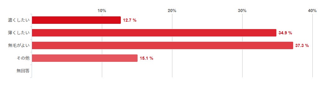 「無毛がよい」37.3%、「薄くしたい」が34.9%と昨今のツルツル肌を好む流行を反映した回答が得られています。一方で「濃くしたい」が12.7%との回答が得られまゆ毛を中心に濃くしたいというニーズがあることがわかりました。
