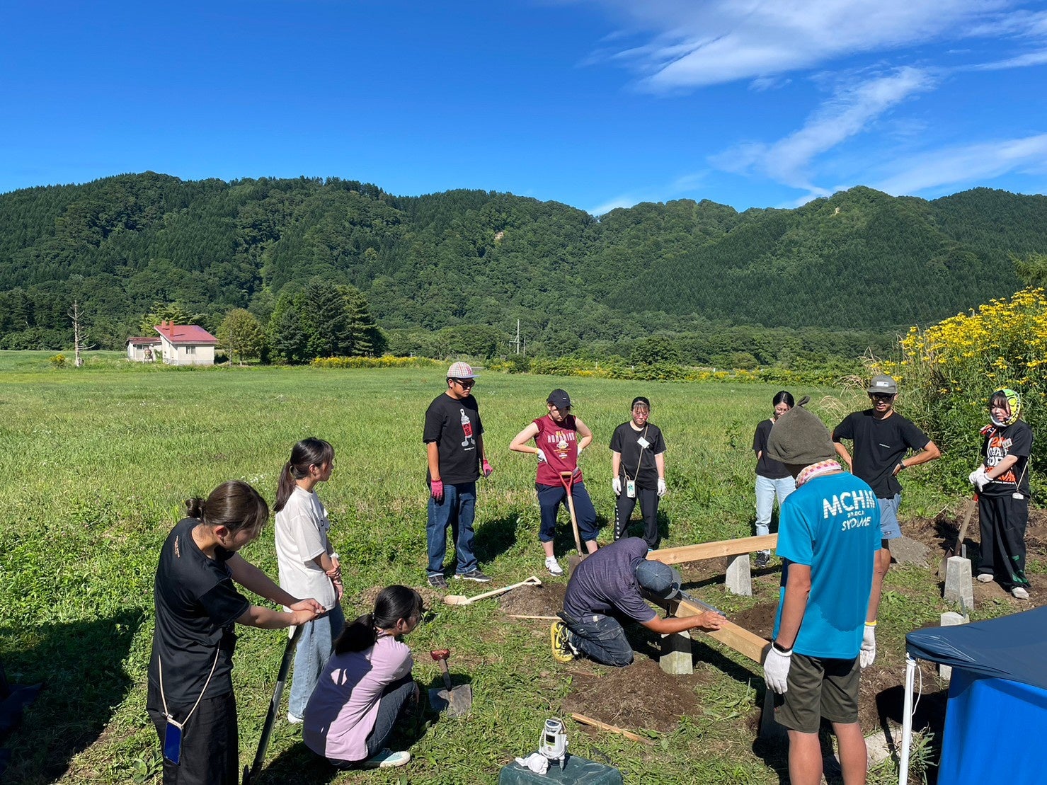 まずはみんなで穴を掘り、束石を埋めて基礎づくり
