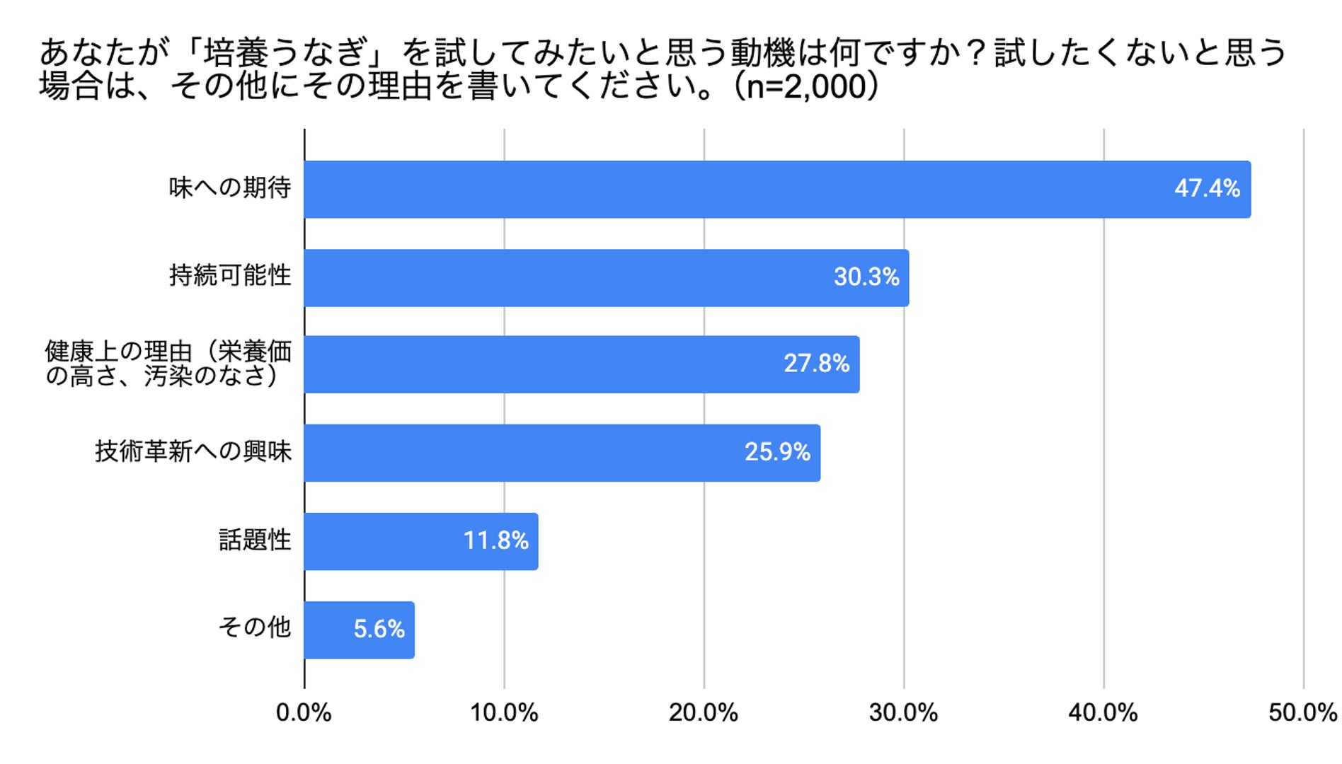 さらに、別の設問において40%近くの回答者が「細胞培養による水産物が乱獲問題の解決策となり、海洋保全に貢献できる」と認識していることが判明しました。同時に、培養うなぎの普及には「味」と「価格」が最も重要な要素であると、多くの回答者が指摘しました。