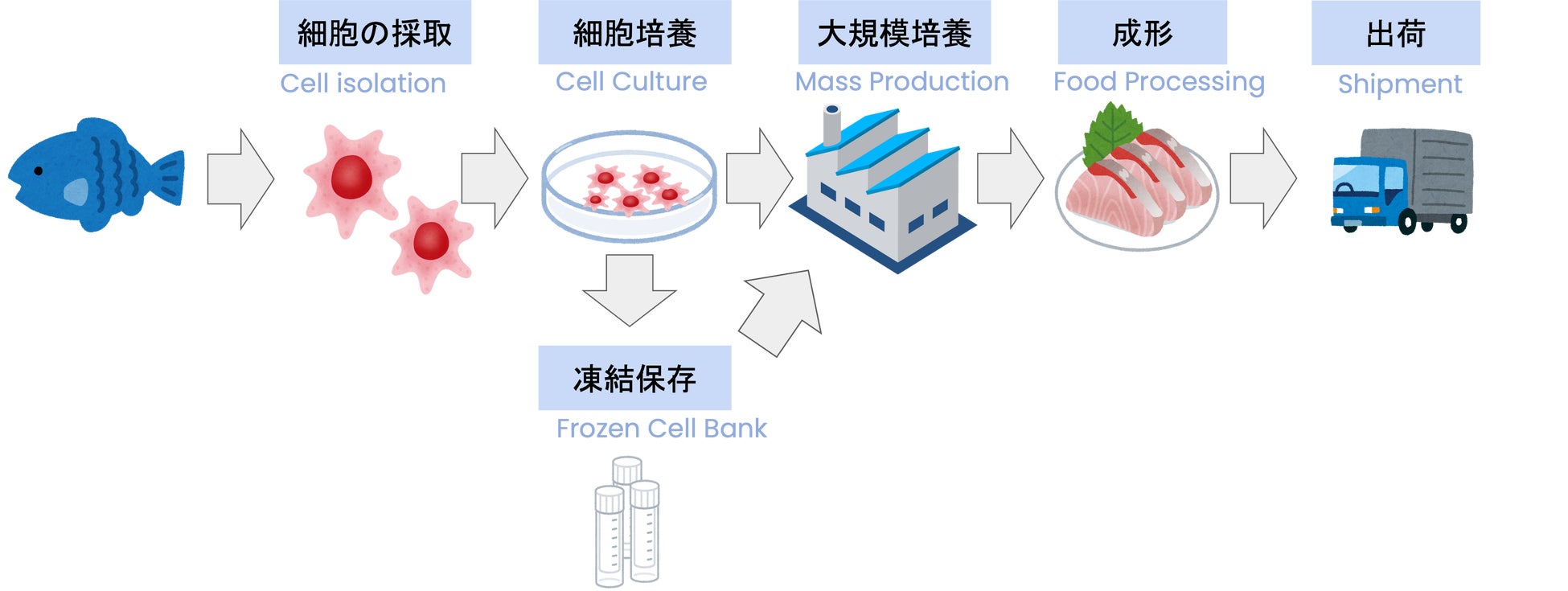 「細胞水産物」とは、魚介類の細胞に栄養を与えて細胞を育て増やすことで生産する水産品です。ビール工場のような大型タンクで細胞を増やし、可食部のみを生産します。細胞は凍らせて保存をすることができるため、将来的には魚・動物の命を奪うことなく、持続的な食料生産が可能になります。