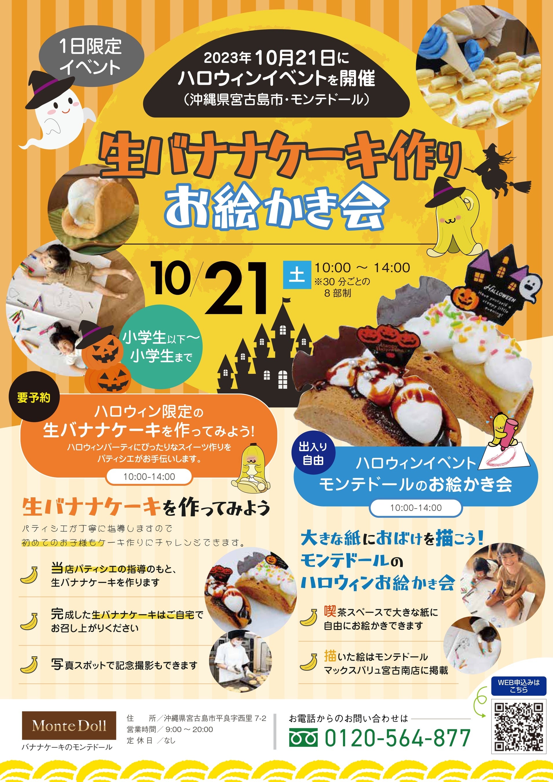 モンテドールのバナナケーキは、宮古島を代表するお土産として愛されて50年以上、お子様にも安心して食べていただける、健康に配慮した”体が喜ぶお菓子作り”に努めてまいりました。 今年の夏に開催いたしました生バナナケーキワークショップがプレスリリース開始から数日で満席となり、おかげさまで大変ご好評をいただきました。 改めてお菓子作りの楽しさと共に、親子が笑顔になれる空間をご提供したいと思い、 皆さまの日常や思い出にそっと寄り添うモンテドールとして、季節を感じるイベントを開催することにいたしました。 楽しいハロウィンを通して普段は出来ない体験と思い出になり、そして、未来の成長につながる貴重な経験になることを願っています。