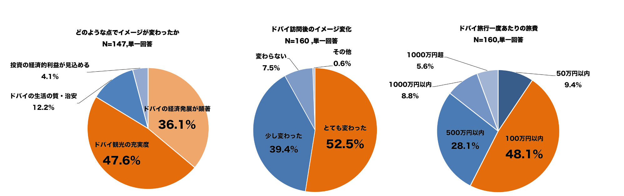 ドバイを訪問後、当初のイメージから「とても変わった」いう回答が約5割(52.5%)を占めました。具体的には、約5割(47.6%)が「ドバイ観光の充実度」と回答。現地の都市開発を目の当たりにし実際にドバイの成長性を肌で感じることで投資への興味に繋がっていることも推測されます。