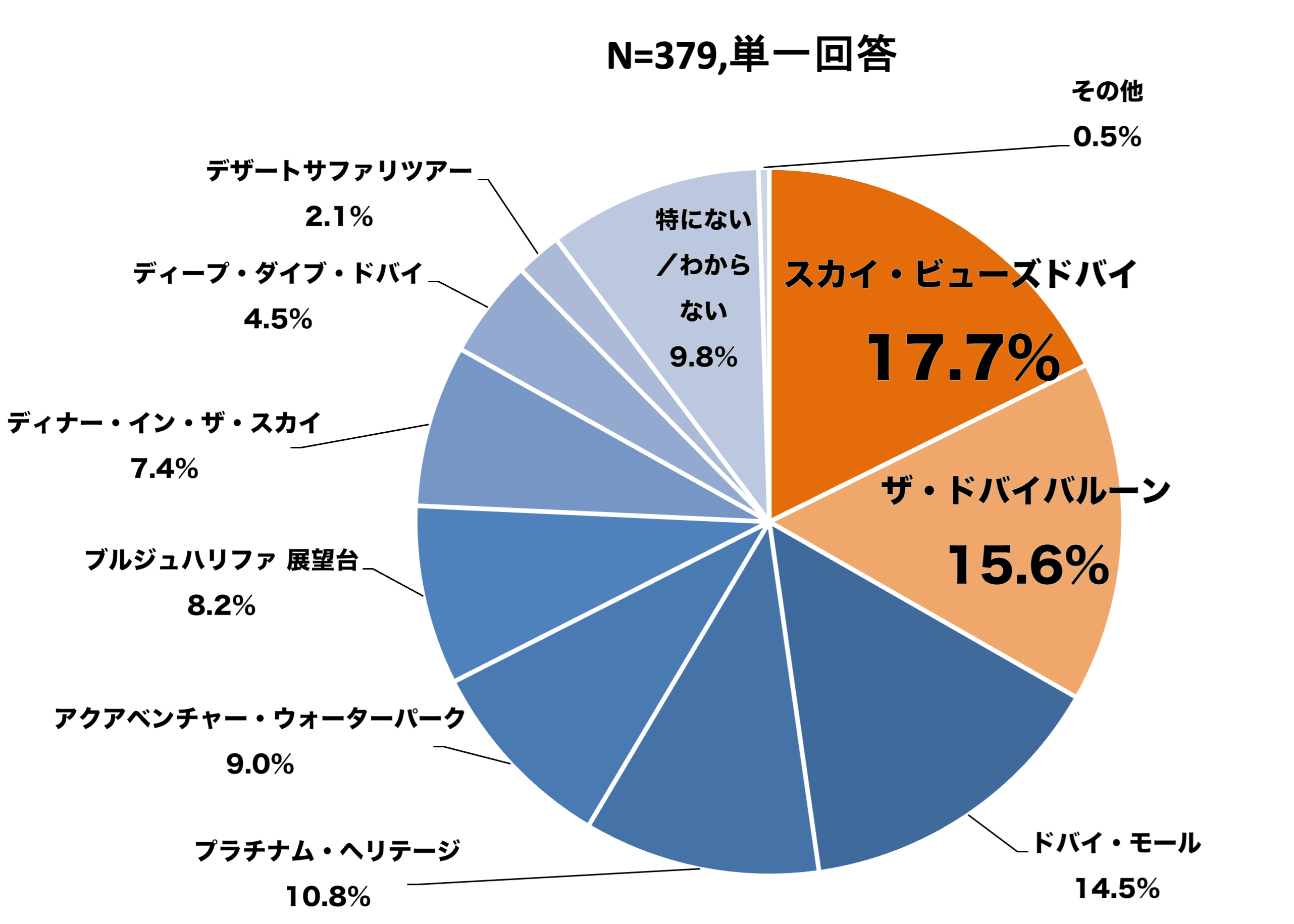 またドバイで最も訪れたい観光スポットについて尋ねると、第一位が非日常体験が楽しめる「スカイ・ビューズドバイ」(17.7%)、第二位が上空300mへと舞い上がる「ザ・ドバイバルーン」(15.6%)となりました。「スカイ・ビューズドバイ」は、地上54階のインフィニティプールを備えるホテル「アドレススカイビュー」内にある展