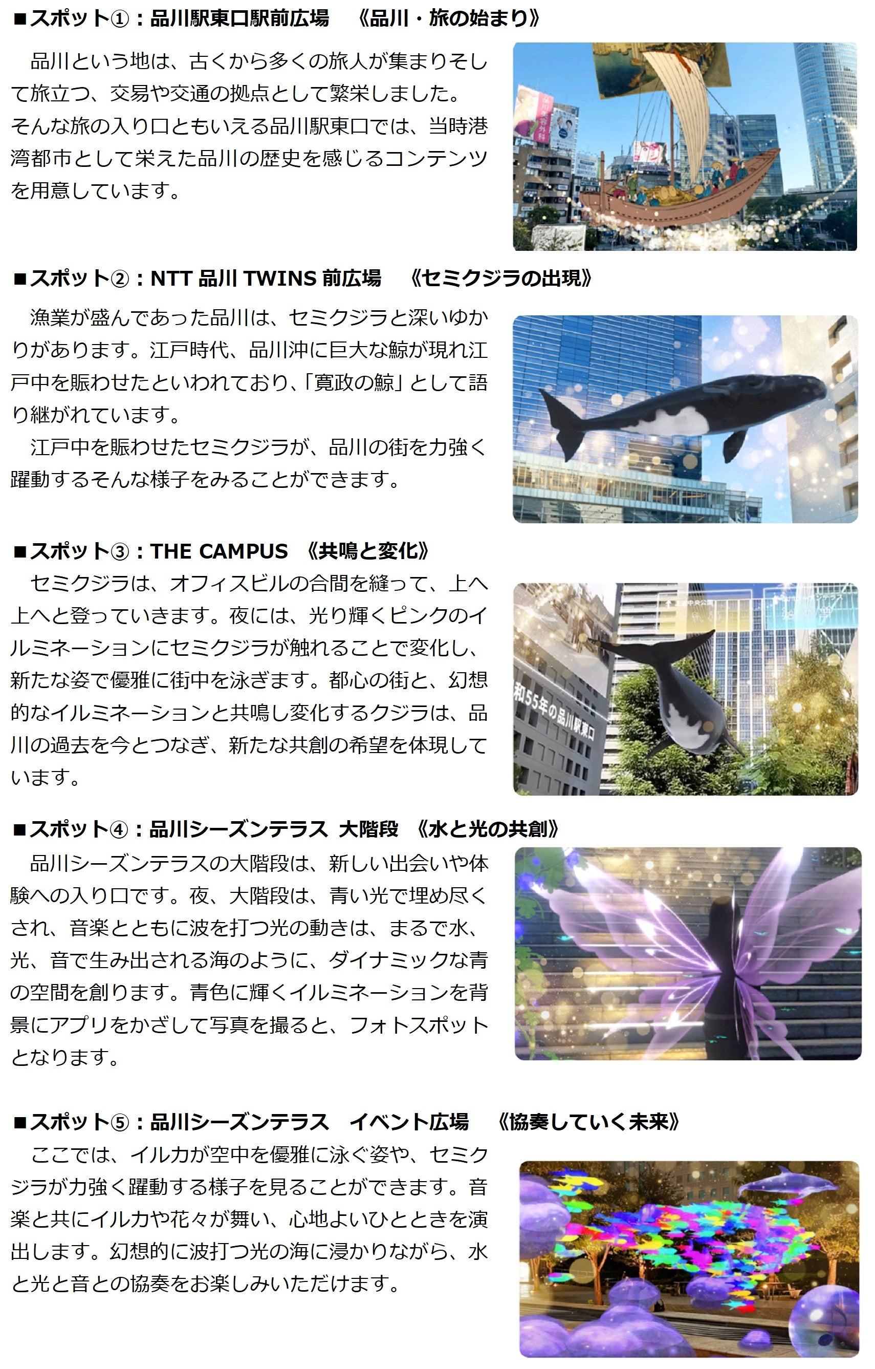 具体的には、イベント参加者は、本イベント専用アプリ※3をお手持ちのスマートフォン等にダウンロードすることにより、各スポットにて品川港南エリアにゆかりのあるXRコンテンツ※4をご覧いただけるほか、夜は品川シーズンテラスなどの一部エリアのイルミネーションとXRがコラボした体験型のXRコンテンツをお楽しみいただけます。さらに、各スポットに隠されたコンテンツを見つけると、限定ポイントが付与され、品川シーズンテラス内の一部飲食店舗にてご利用いただけます。