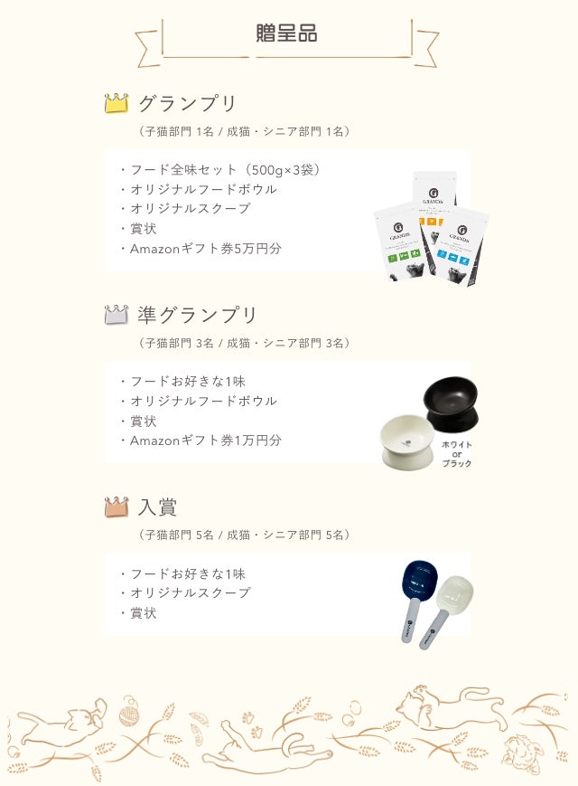 グランプリ受賞者にはGRANDSプレミアムキャットフード全味セット(1.5kg分)と非売品オリジナルグッズ、Amazonギフト券5万円分をプレゼント!