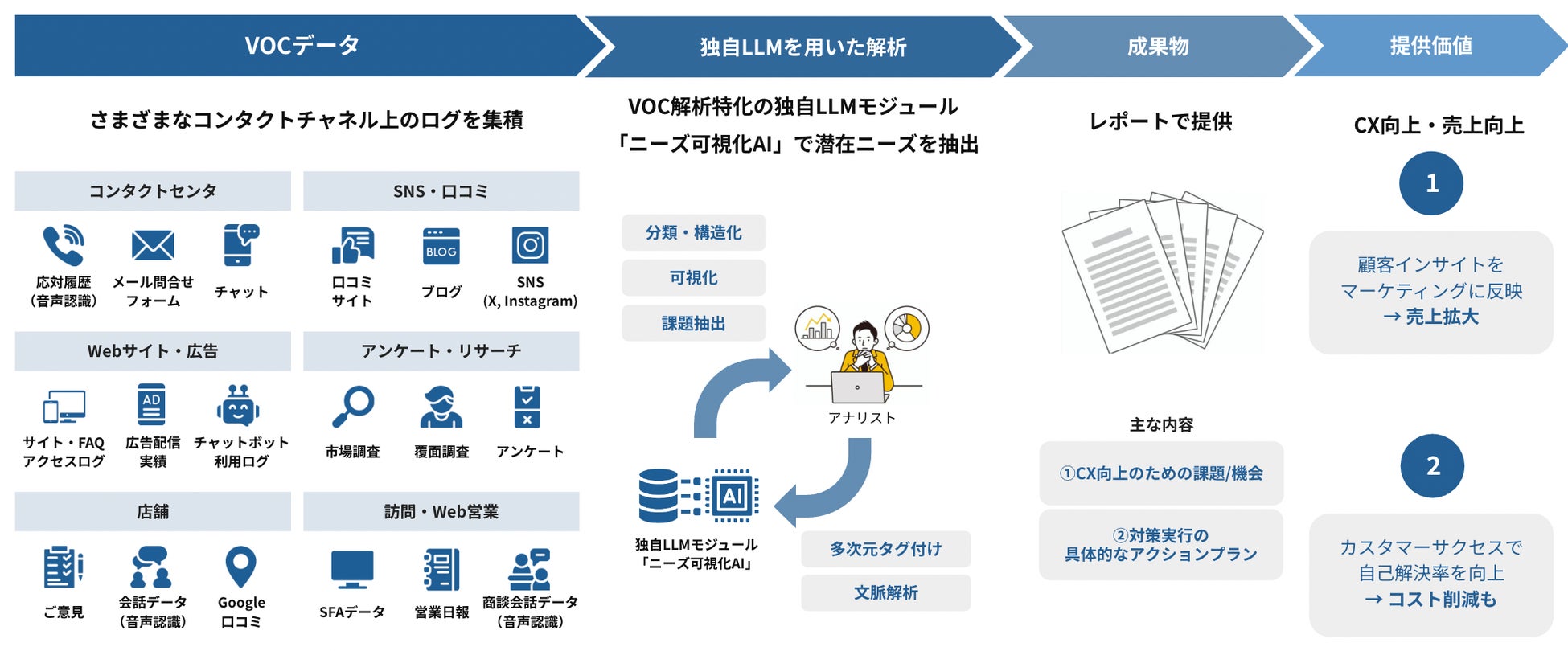 chatGPTなど生成AIに使われているLLM(大規模言語モデル)をVOCデータ分析用に特化させた独自LLMモジュール「ニーズ可視化AI」を正式にリリースしたことをお知らせいたします。