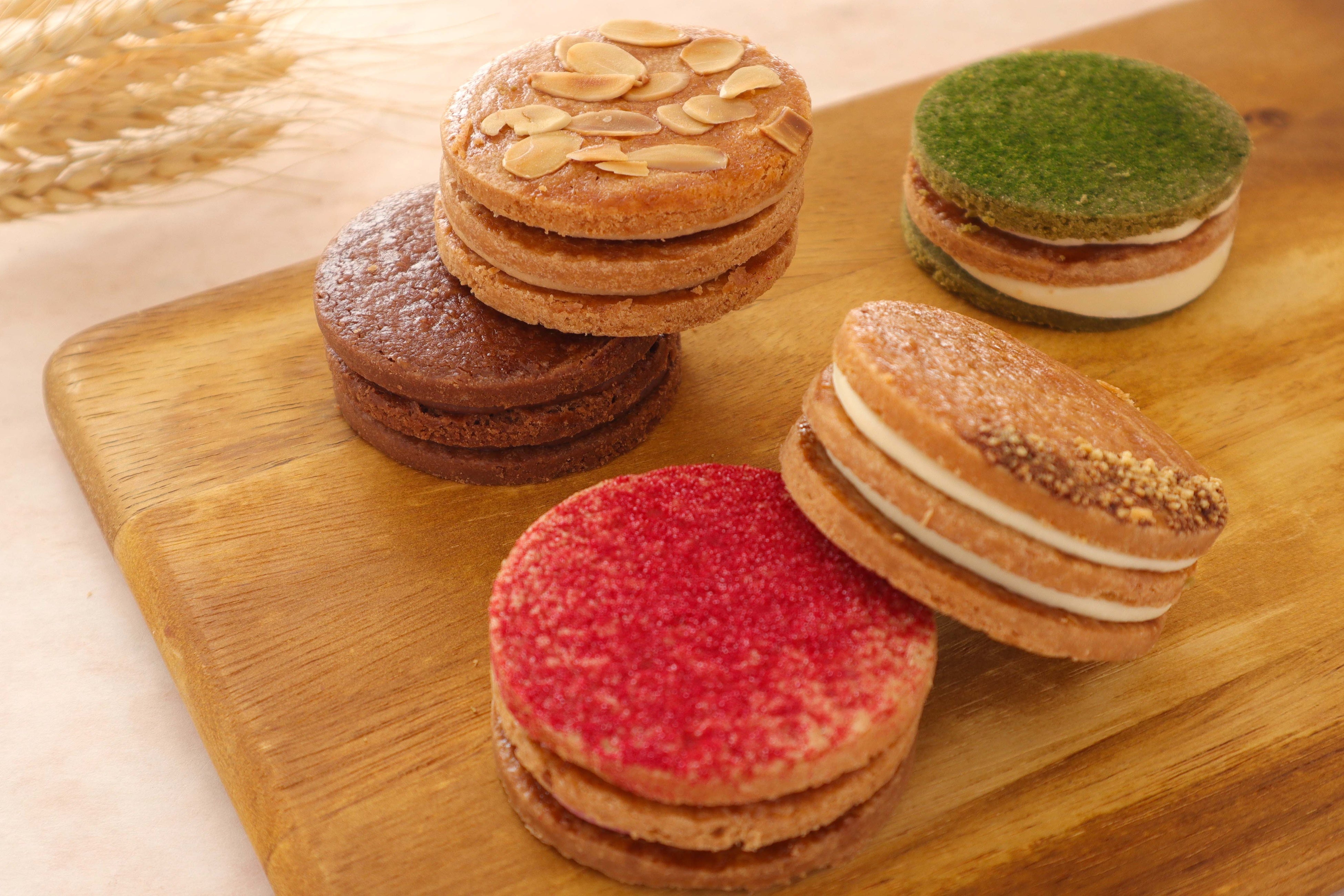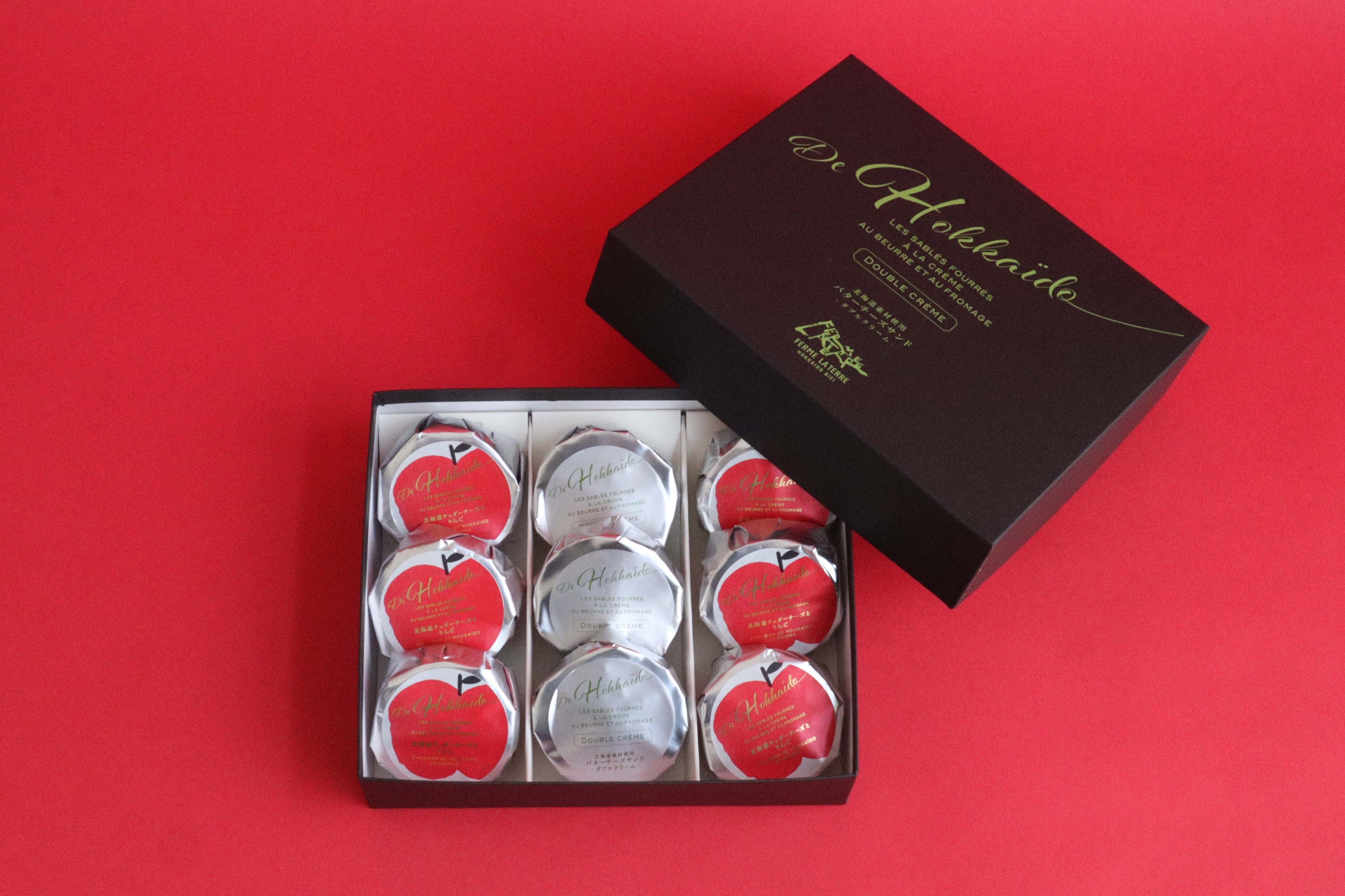 普段の味揃えは、ダブルクリーム、カマンベール、ダブルチョコレート、ローストナッツ、フランボワーズ、抹茶と柚子の6種類で、北海道の素材のおいしさを生かしておつくりした2層のクリーム仕立ての常温タイプ。3枚のサブレで、2層のクリームをサンドしています。