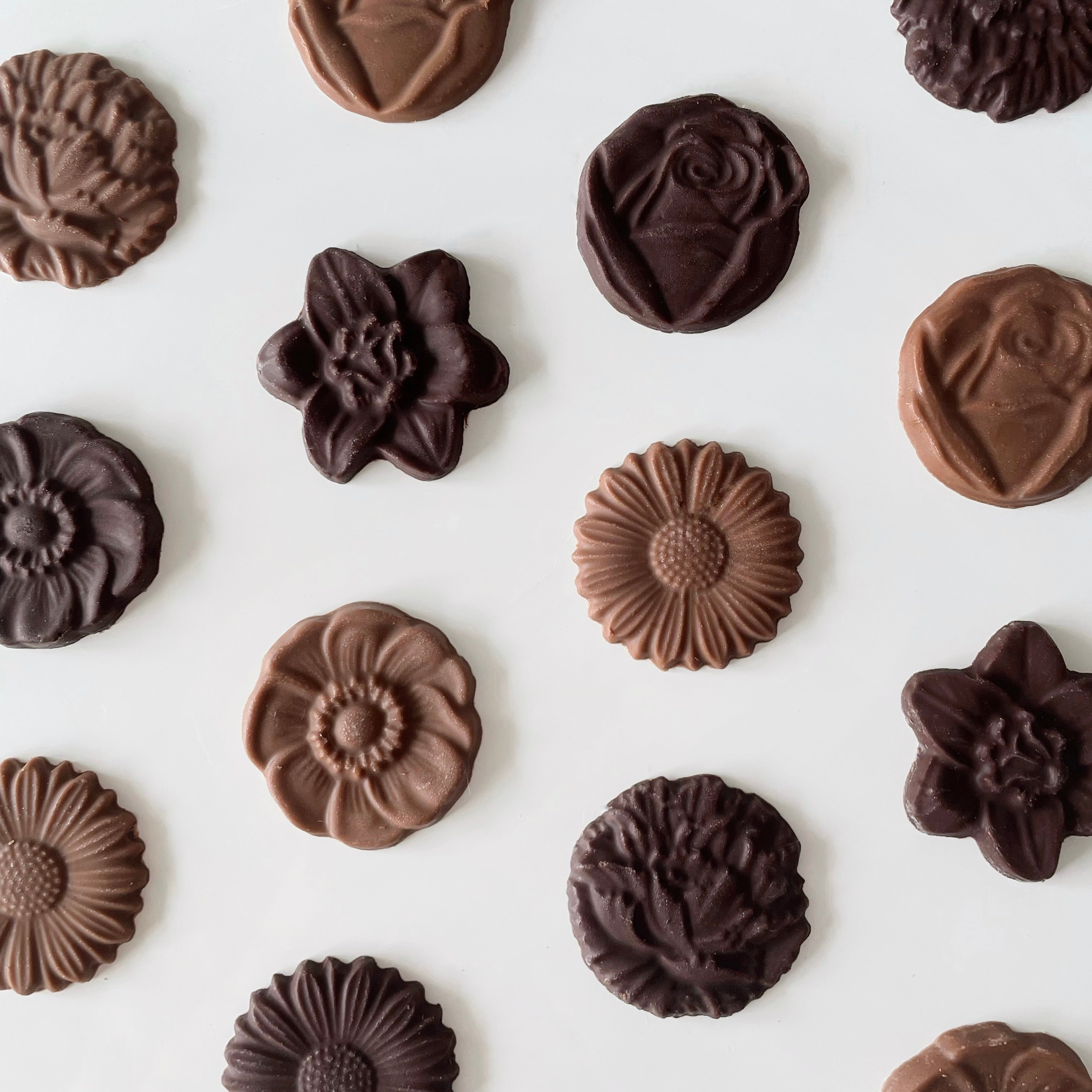 マーガレットやローズ、ポピーなど かわいらしいお花のかたちをしたチョコレート。 ティータイムやお酒に添えてもぴったりです。