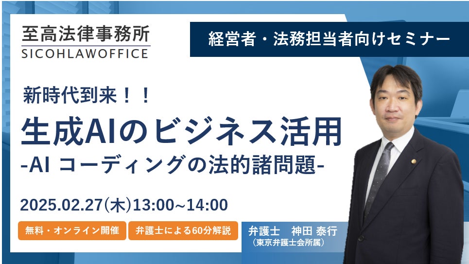 企業の法律問題に精通した至高法律事務所(所在地:東京都千代田区、代表弁護士:園部 洋士)は「生成AIのビジネス活用-AIコーディングの法的諸問題-」を2月27日(木)に開催いたします。