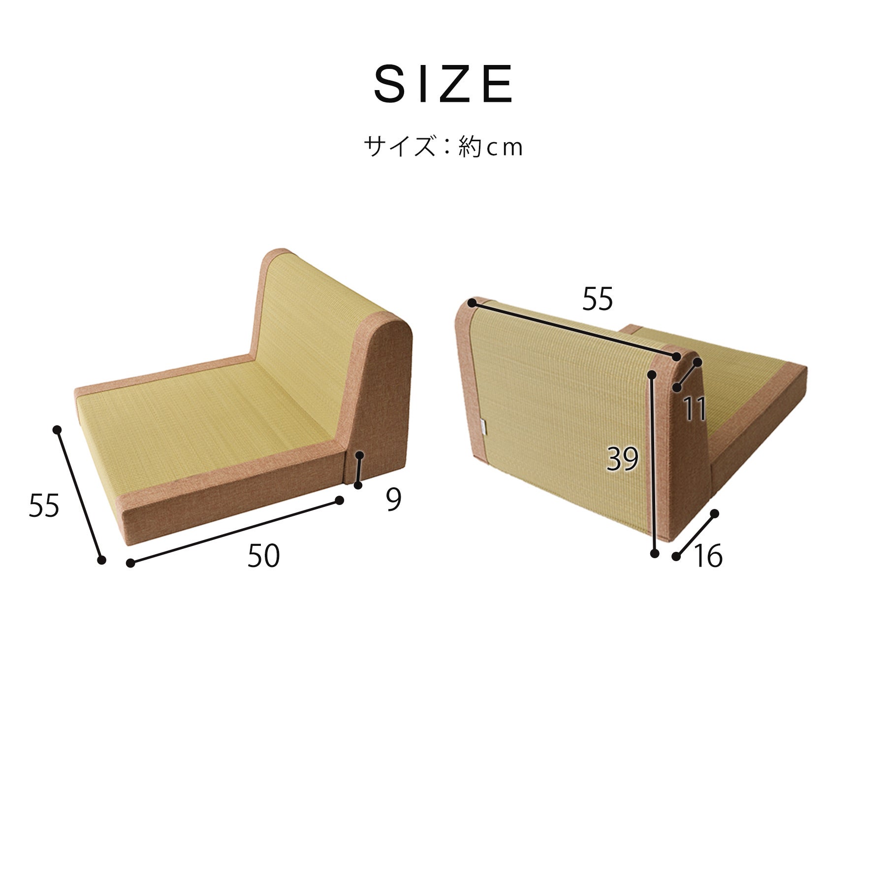 当商品は、畳の材料であるい草を座面や背もたれ部分に使用しており、自然素材の癒しを体感できる座椅子です。和モダンですっきりとしたデザインはどんなお部屋のコーディネートにもマッチ。座椅子としてだけでなく、ひとり用ローソファーとしてもご使用いただけます。リビングルームやワークスペースなど、使いたいお部屋へポータブルに持ち運び可能。畳の座椅子「坐楽」で、まるで旅館のお部屋にいるようなくつろぎの時間を過ごしてみませんか。