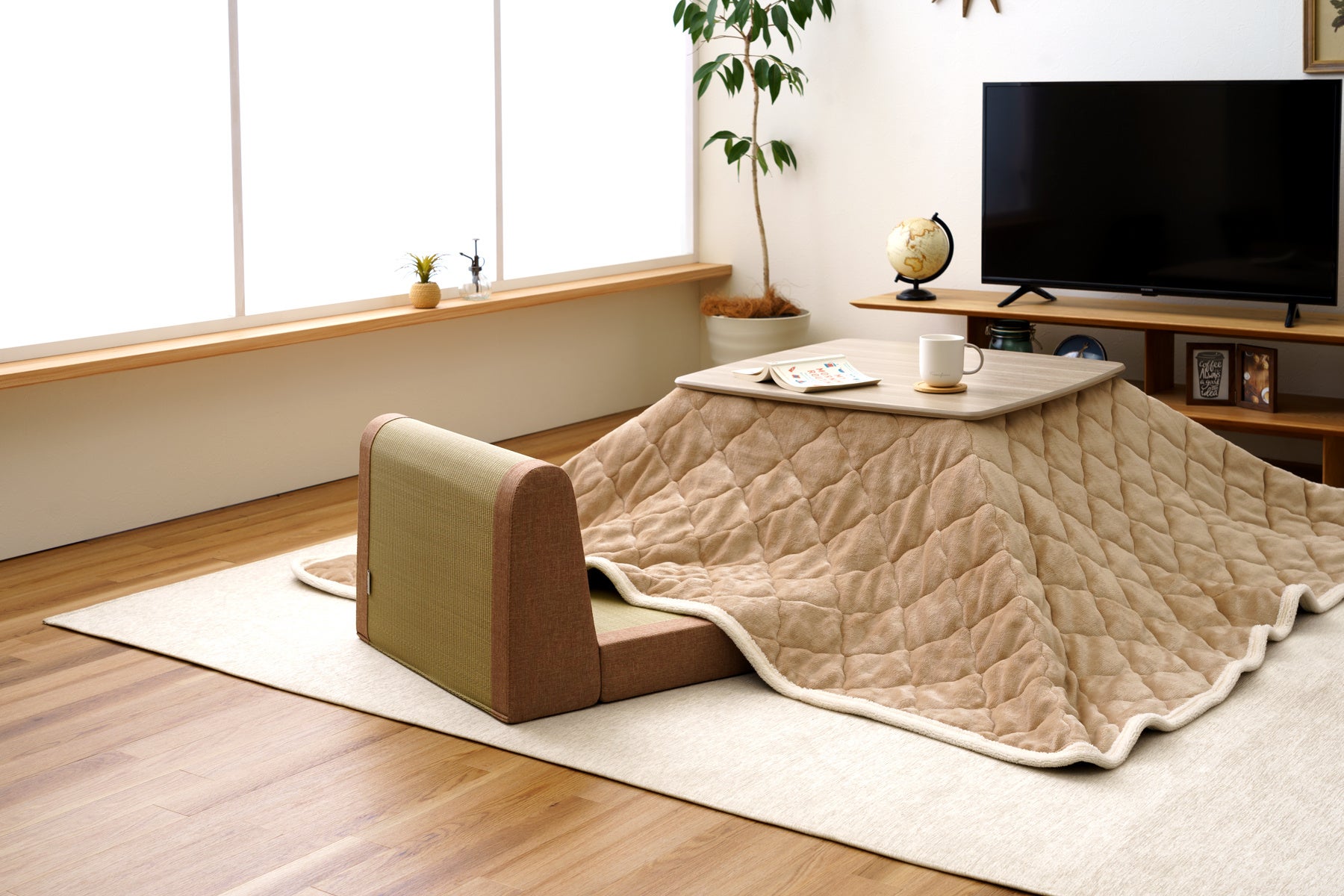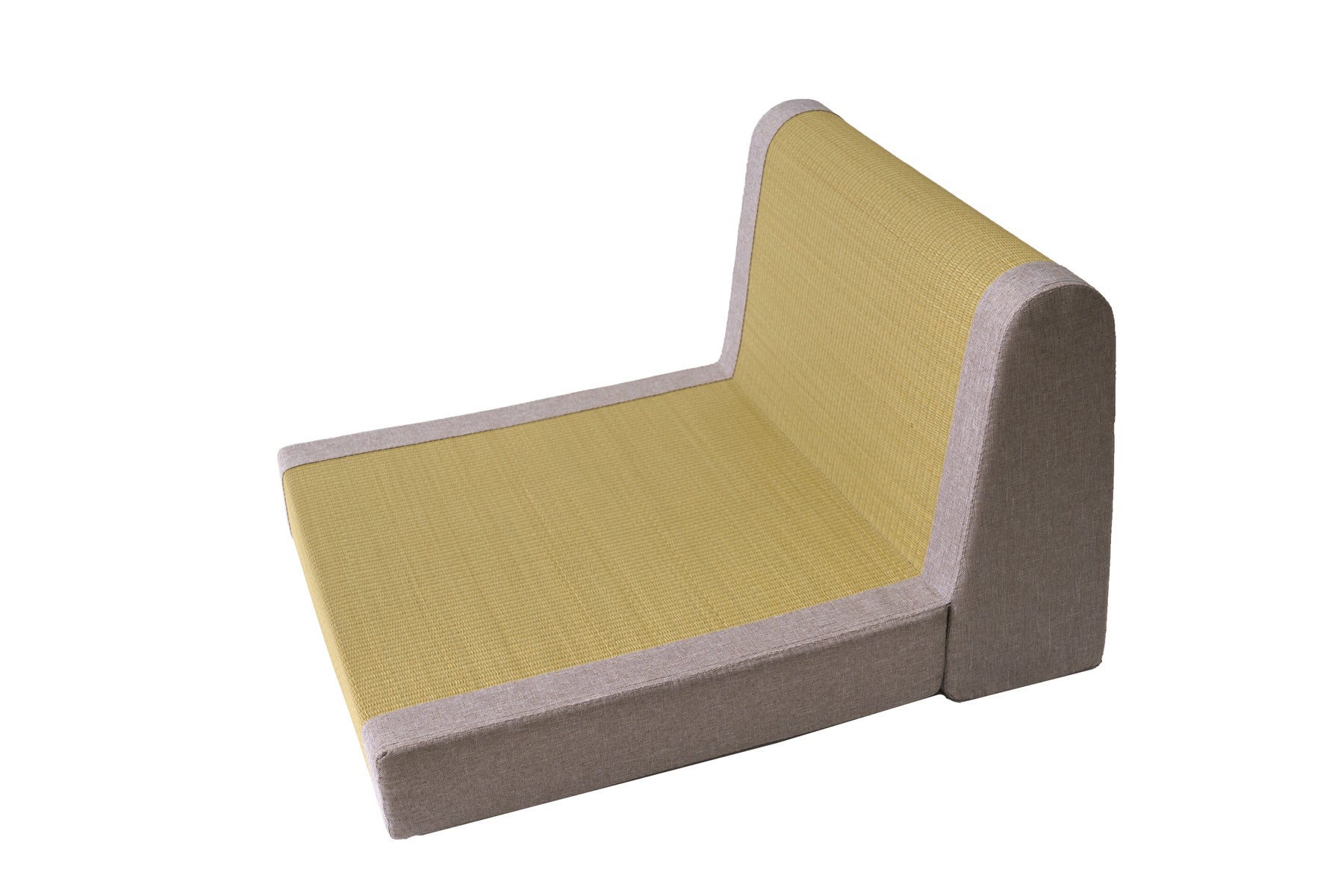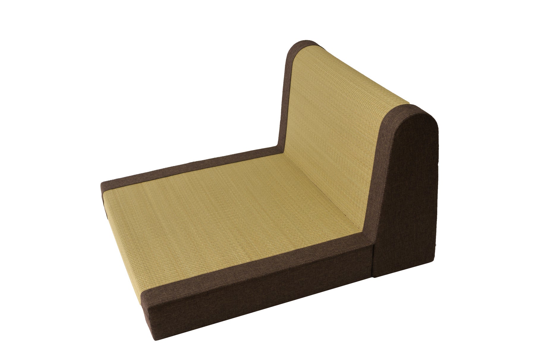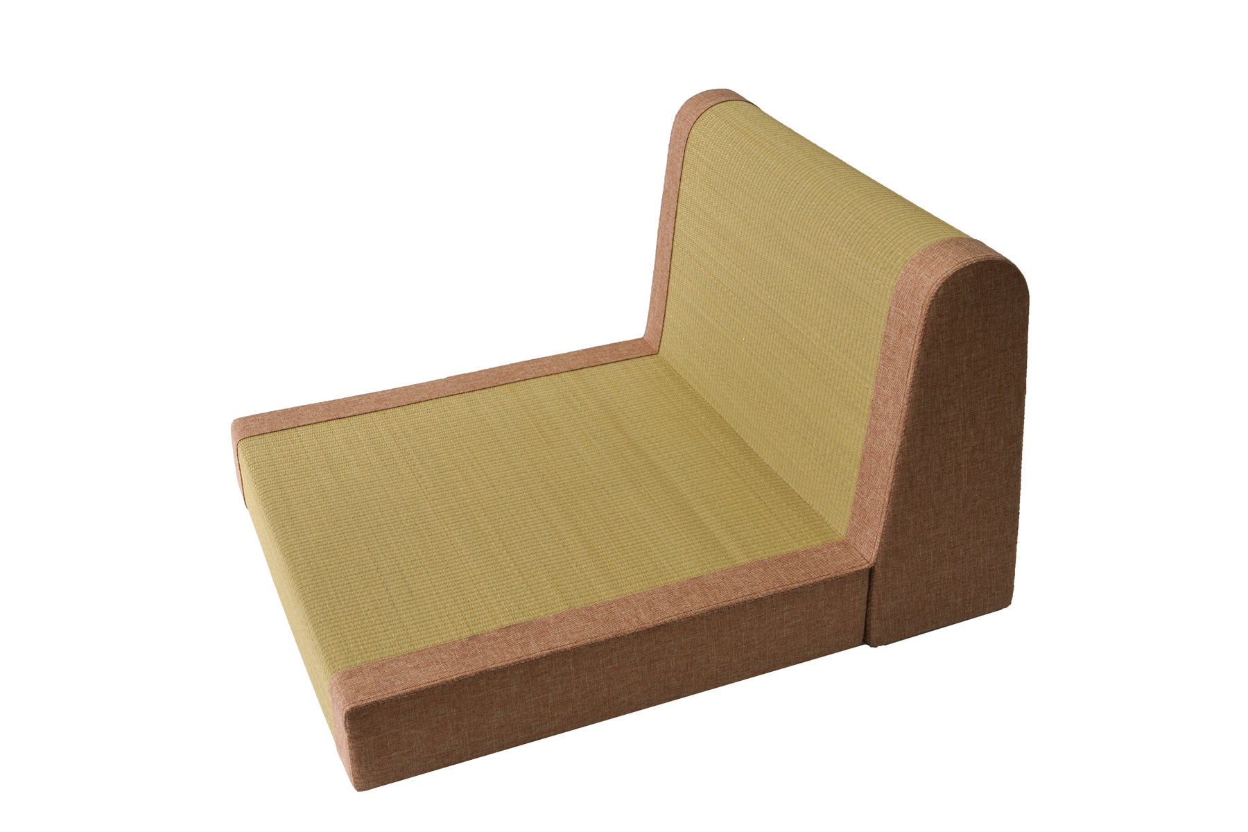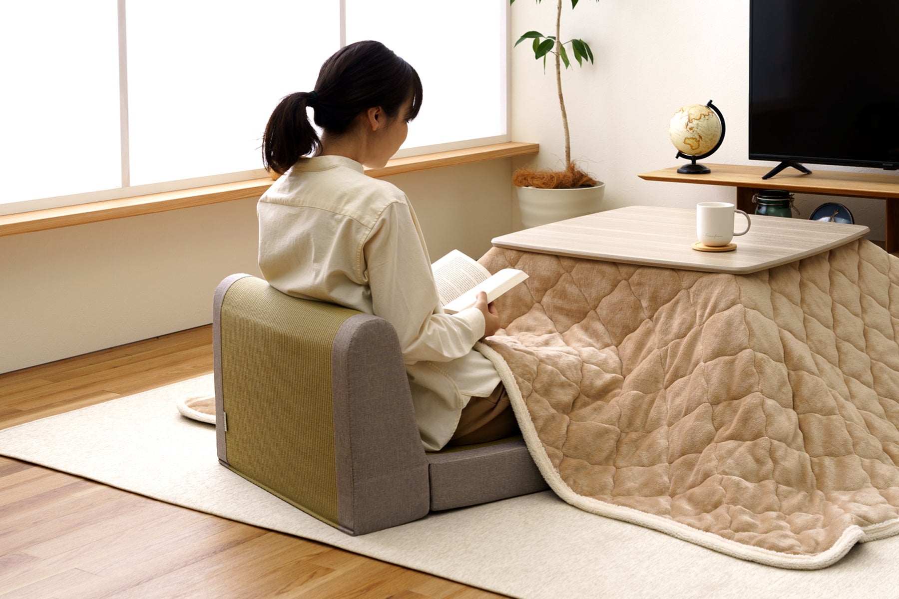 「坐楽 座椅子」は畳の素材であるい草の織生地を表地として使用した、今までにない和の座椅子です。そのスッキリしたデザインは和にも洋にもあわせやすく、フローリングのお部屋にいながら畳でくつろぐ感覚を手軽に味わうことができます。しっかりとしたクッション性の中材を使用しているので、ひとり用のローソファーとしてもおすすめ。こたつと組合わせてぬくもりのある空間を演出することも可能です。