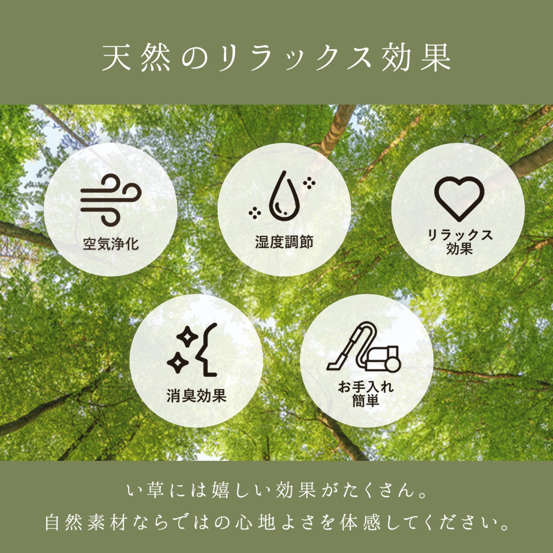 表生地に使用しているい草には、その素材そのものが備えている素晴らしい効果があります。畳の部屋で感じることができるリラックス感はもちろん、湿気を吸収する力や消臭する力、空気をキレイにしてくれる力など、私たちの暮らしにやさしい機能をたくさん持ち合わせています。