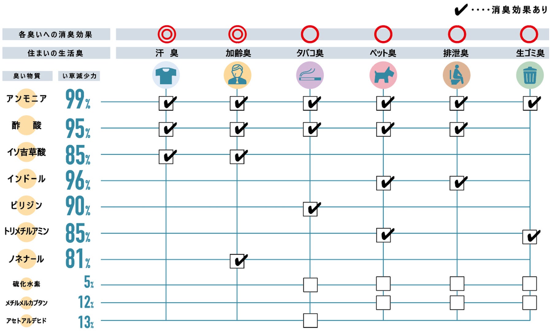 生活の中で発生する汗臭や加齢臭、ペット臭、タバコ臭などさまざまなニオイの原因物質を減少させる力がい草にはあります。特に汗臭の元であるアンモニアについては99%を減少させることができ、たとえ長時間の使用で汗をかいたとしても汗のニオイが商品に残ることはありません。