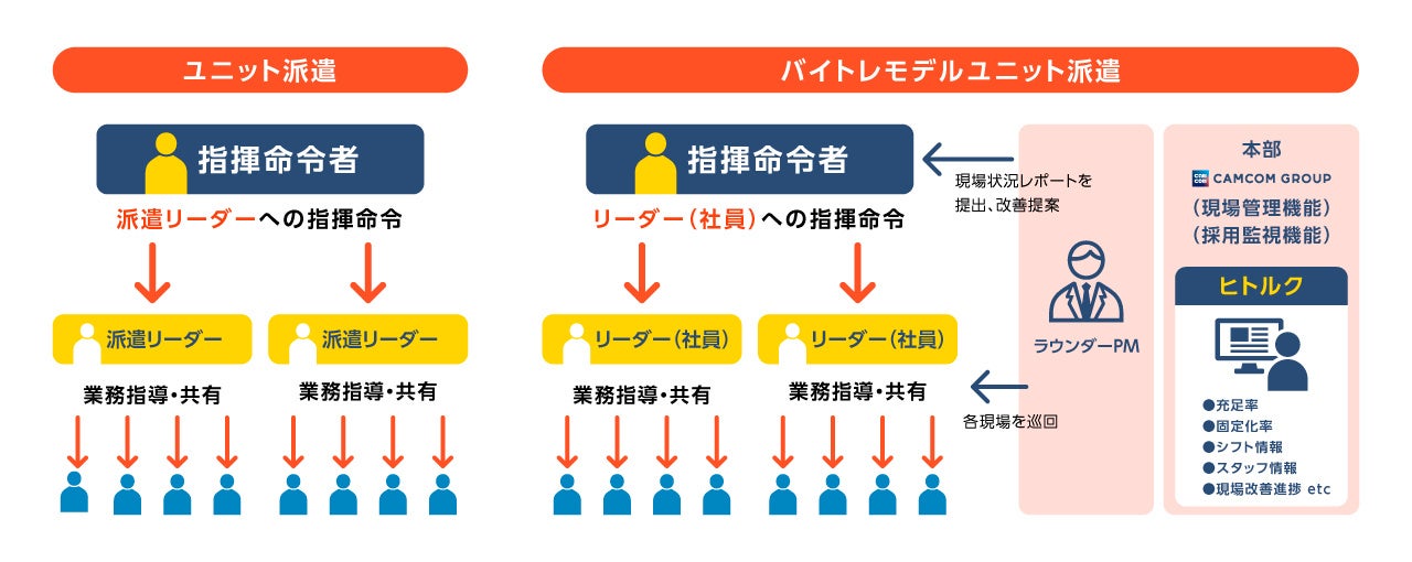 バイトレが提供するユニット派遣サービスは、キャムコムグループの強みを最大限に活かし、高い生産性と品質を持続できる仕組みがあります。