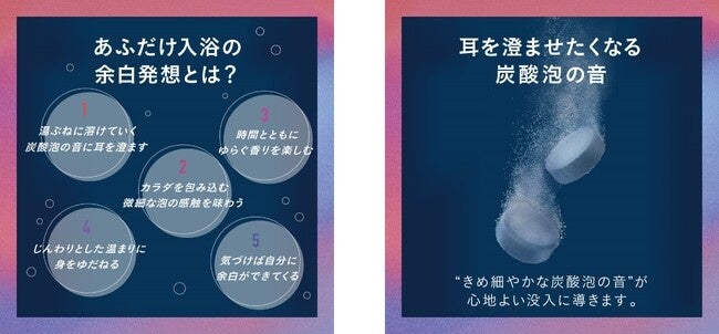 「バブ あふれるのはきっと、お湯だけじゃない(以下略:あふだけ)」は、情報過多な現代だからこそ、 “なにもしない、を、あえてやる”「ちゃんと、ぼーっとする時間」に価値を見出している、若年層の入浴実態に着目。約10分間継続する炭酸泡の音と心地よい香りで感覚に身をゆだねることで、ノイズとなる様々な情報からシャットアウトされる “没入入浴”を促し、自身からあふれだすアイディア等に喜びを感じてもらう新しい入浴時体験を提案する商品です。発売開始をしてから「ちゃんと、ぼーっとする時間を大切にしたい」という共感のお声を多くいただいております。