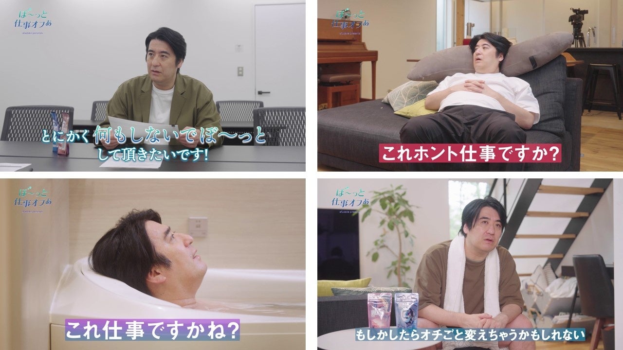 体験していただくのは、数々の映像企画を生み出し、深夜はラジオ番組を持ち、常に活動し続けているテレビプロデューサーの佐久間宣行さん。トイレの時間ですら動画を見るほど余白時間をとらないという佐久間さんは、「何もしないでちゃんと、ぼ~っとしてください」という仕事のオファーに「これ、本当に仕事ですか!?」驚きつつ、部屋やお風呂でぼ~っとしながら半日を過ごししていただきました。動画では「考える体力が湧いてきた」と話し、「大人はぼーっとするには準備がいるんだ」と何もしないことの大切さを実感、悩んでいた脚本のアイディアが浮かんできたと、すっきりとした表情で話す様子を見せました。 本映像を通して、より多くの方に「ちゃんと、ぼ~っと」することで生まれる体験価値を感じていただき、積極的にその時間をつくるきっかけになれたら、と考えています。