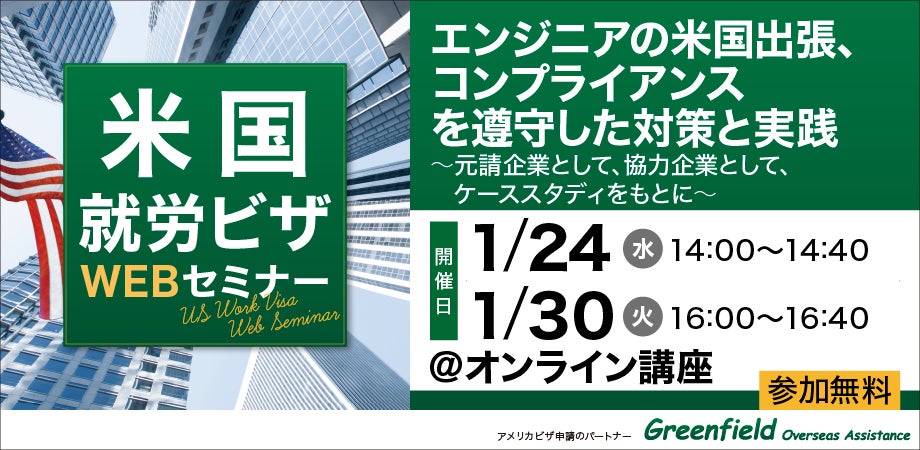 <1月24日(水)、1月30日(火)開催!無料Webセミナー>「エンジニアの米国出張、コンプライアンスを遵守した対策と実践」