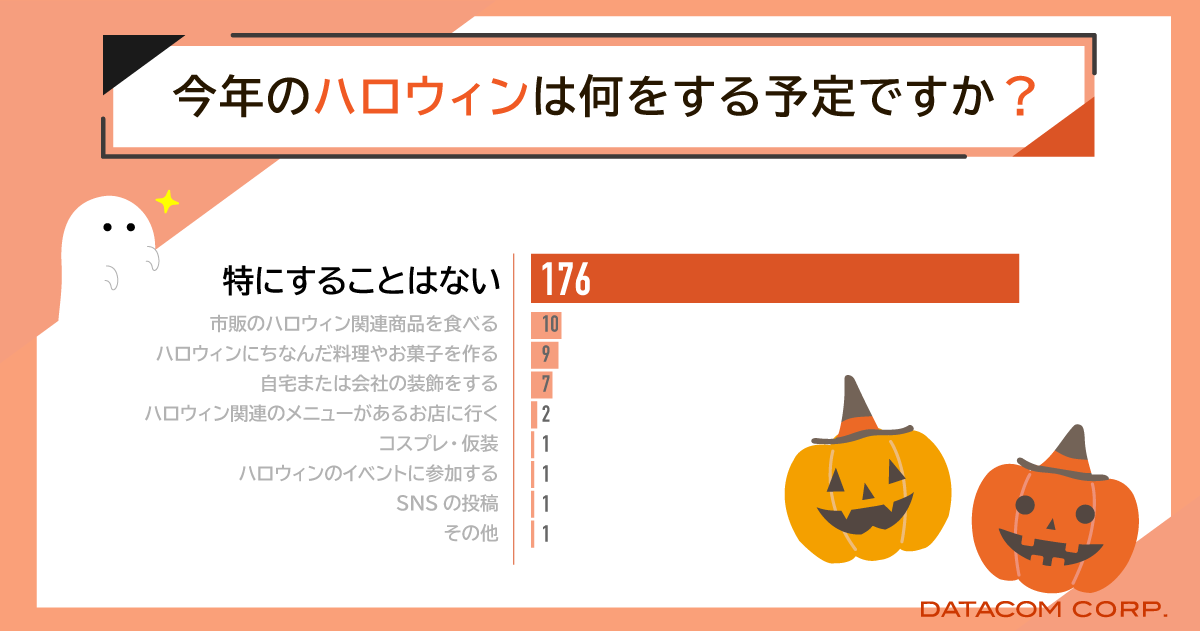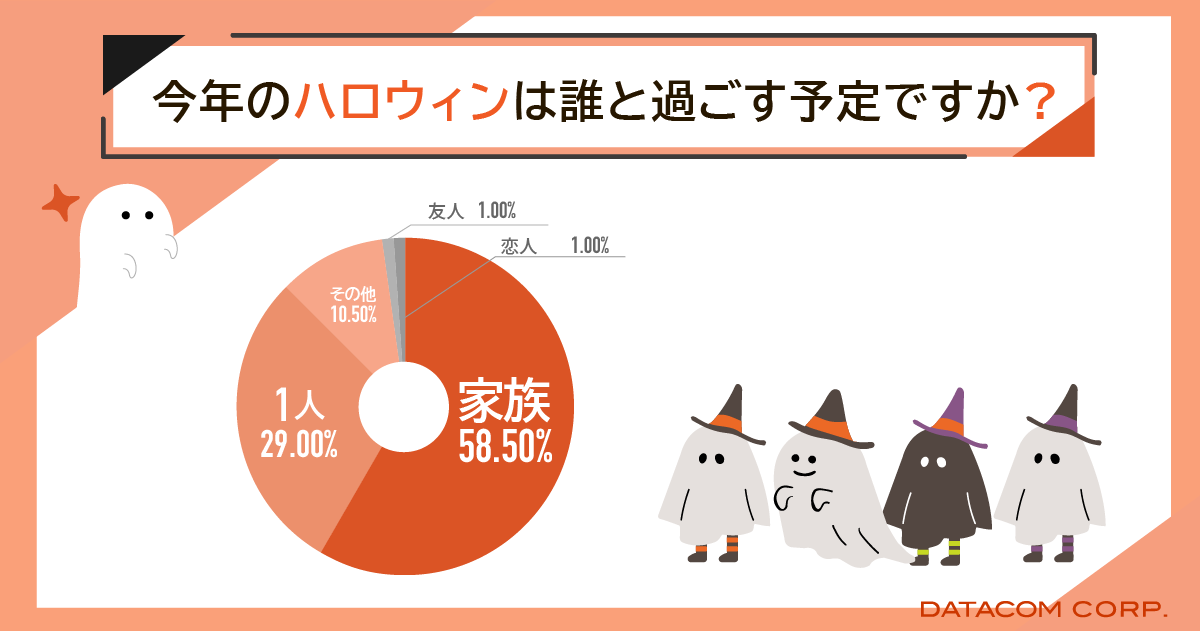 「今年のハロウィンは誰と過ごす予定ですか」と聞いた所、「家族」の回答が58.5%、「1人」が29.0%、「その他」が10.5%でした。コロナ自体はかなり収束してきているものの、大人数ではなく家族と過ごす人が多いことが分かりました。