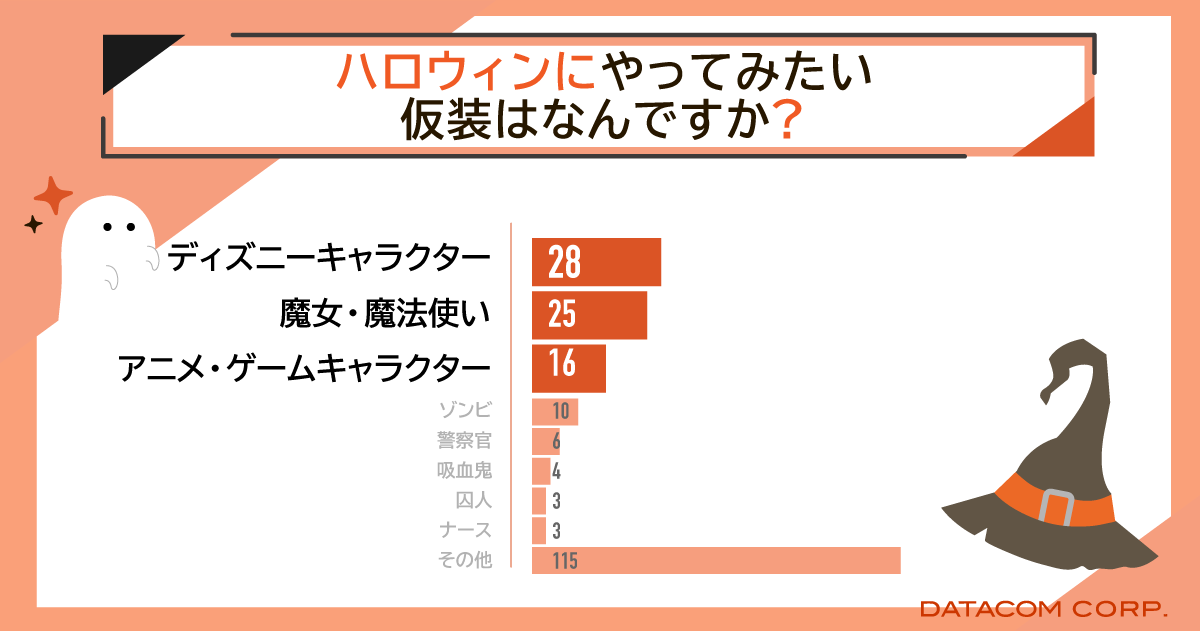 「ハロウィンにやってみたい仮装は何ですか?(複数回答可)」と聞いた所、「その他」が57.5%、2位が「ディズニーキャラクター」14.0%、3位が「 魔女・魔法使い」12.5%となりました。その他の回答の中では過半数以上が「何もしない」という回答で仮装をするという習慣自体、あまり根付いていない世代であることが分かったと共に、中高年〜シニア世代でもディズニーキャラクターの認知度があることが分かりました。