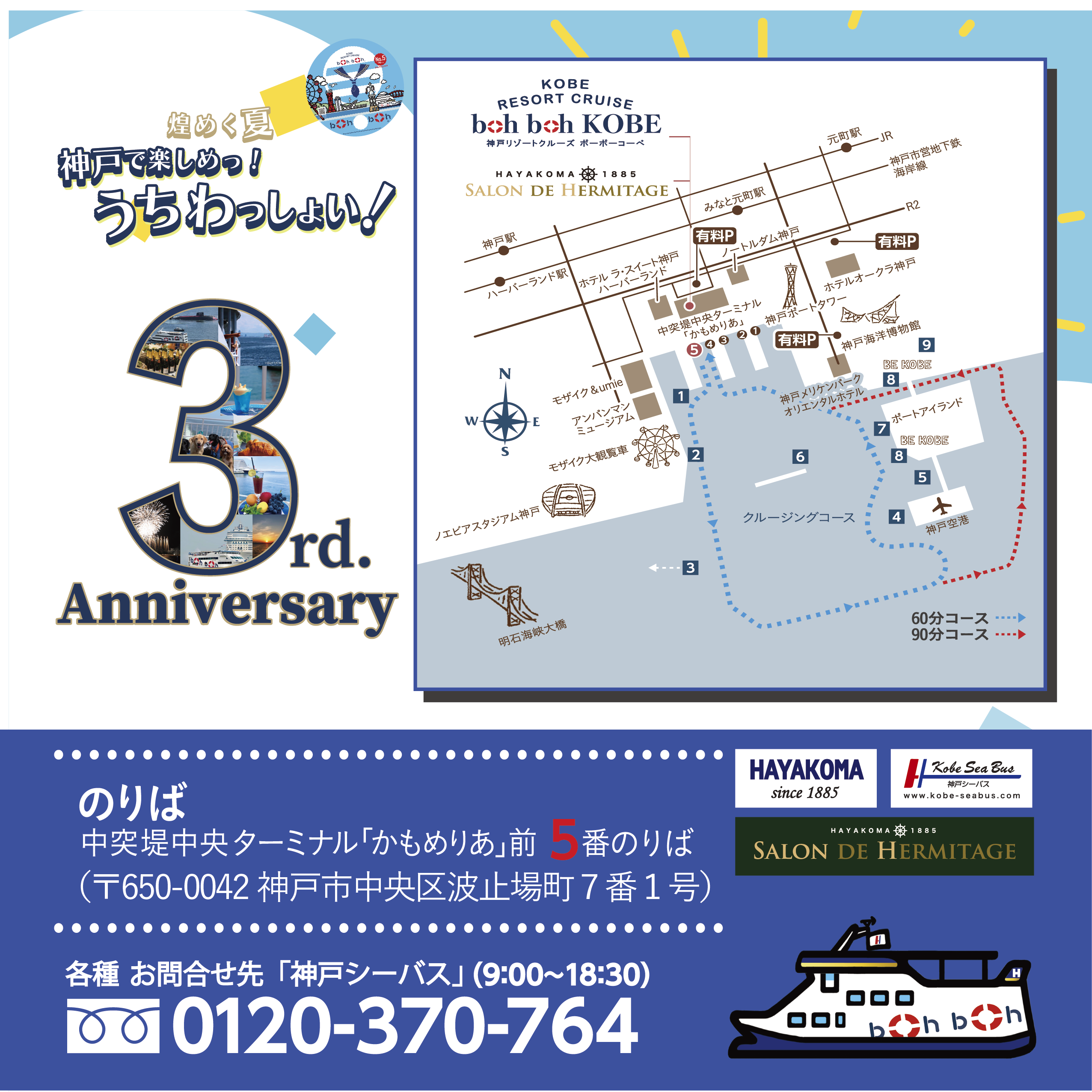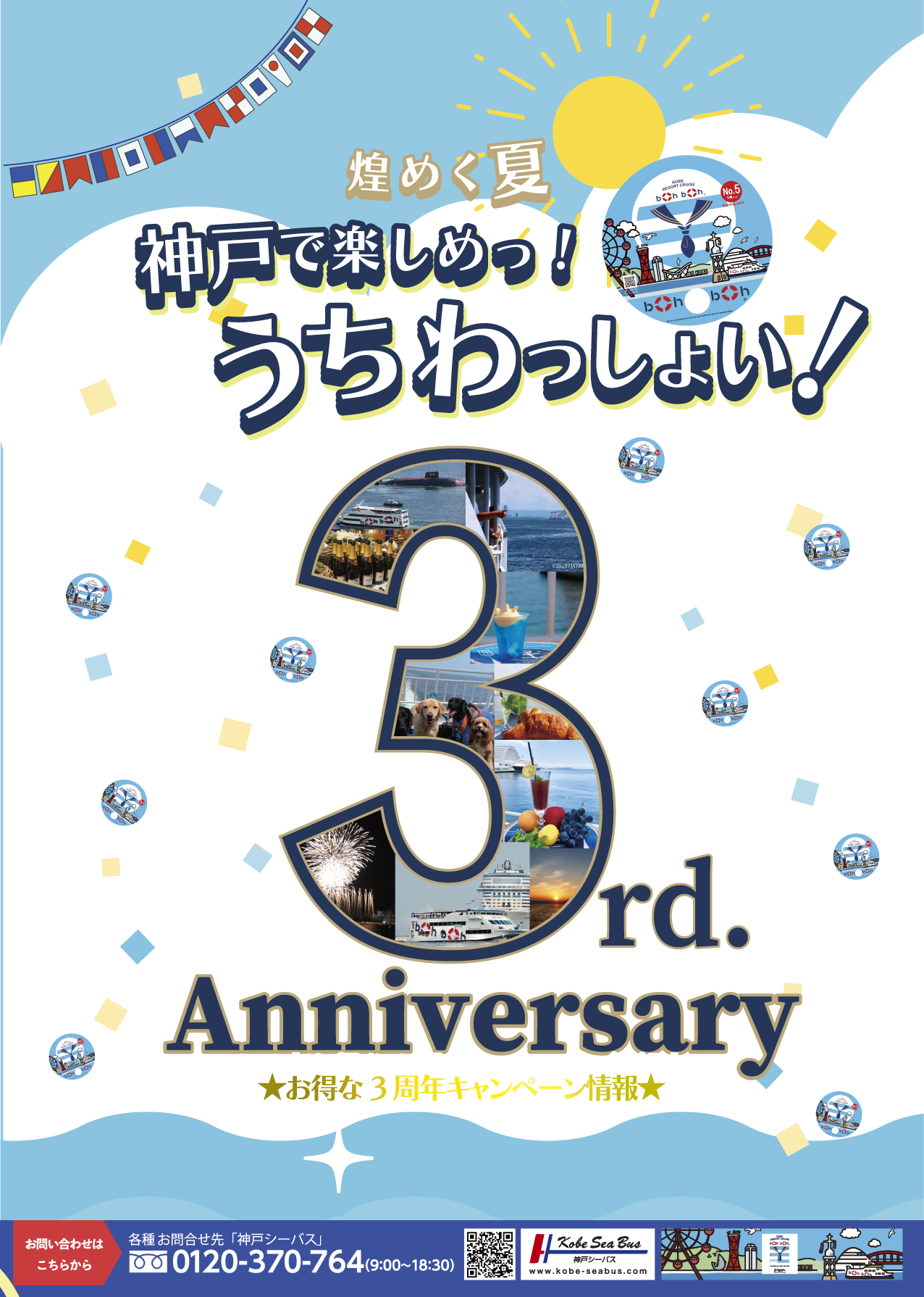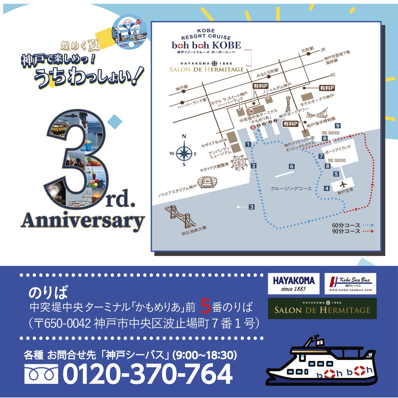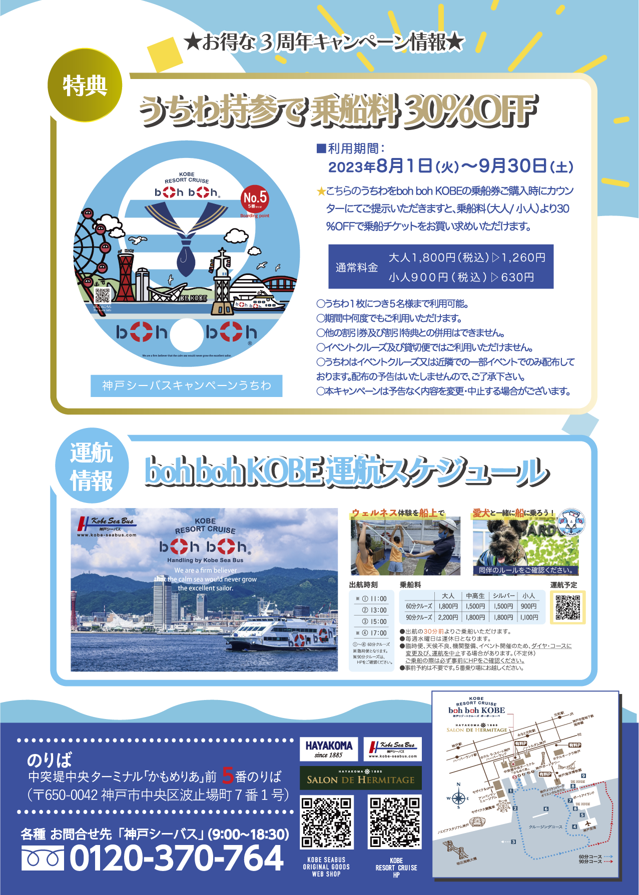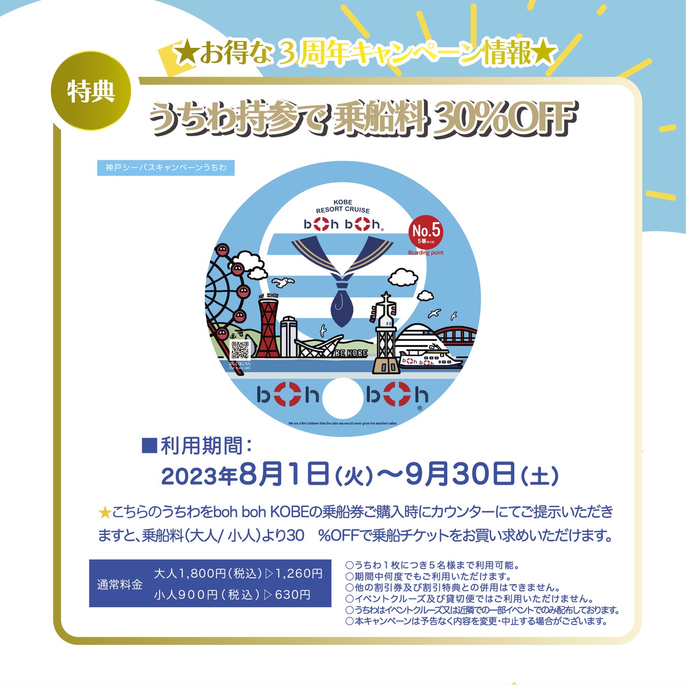 神戸シーバスboh boh KOBEは、9月20日に就航3周年を迎えます。3周年の記念キャンペーンとして【煌めく夏 神戸で楽しめっ!うちわっしょい!~boh boh KOBE 3rd Anniversary~】を開催中です。